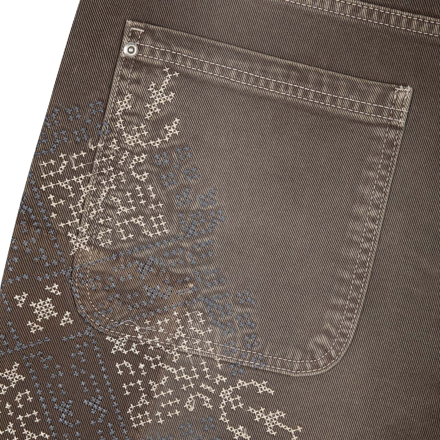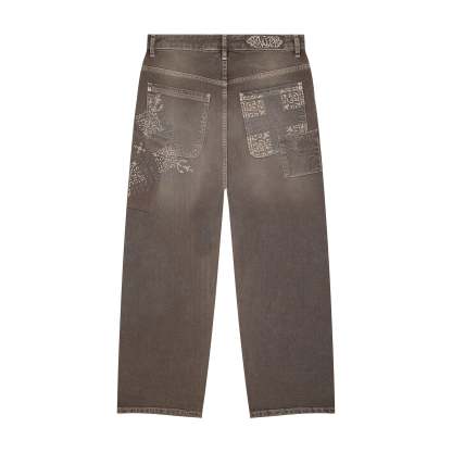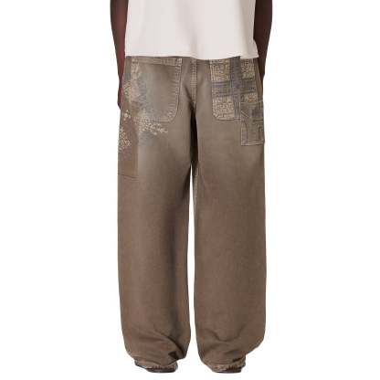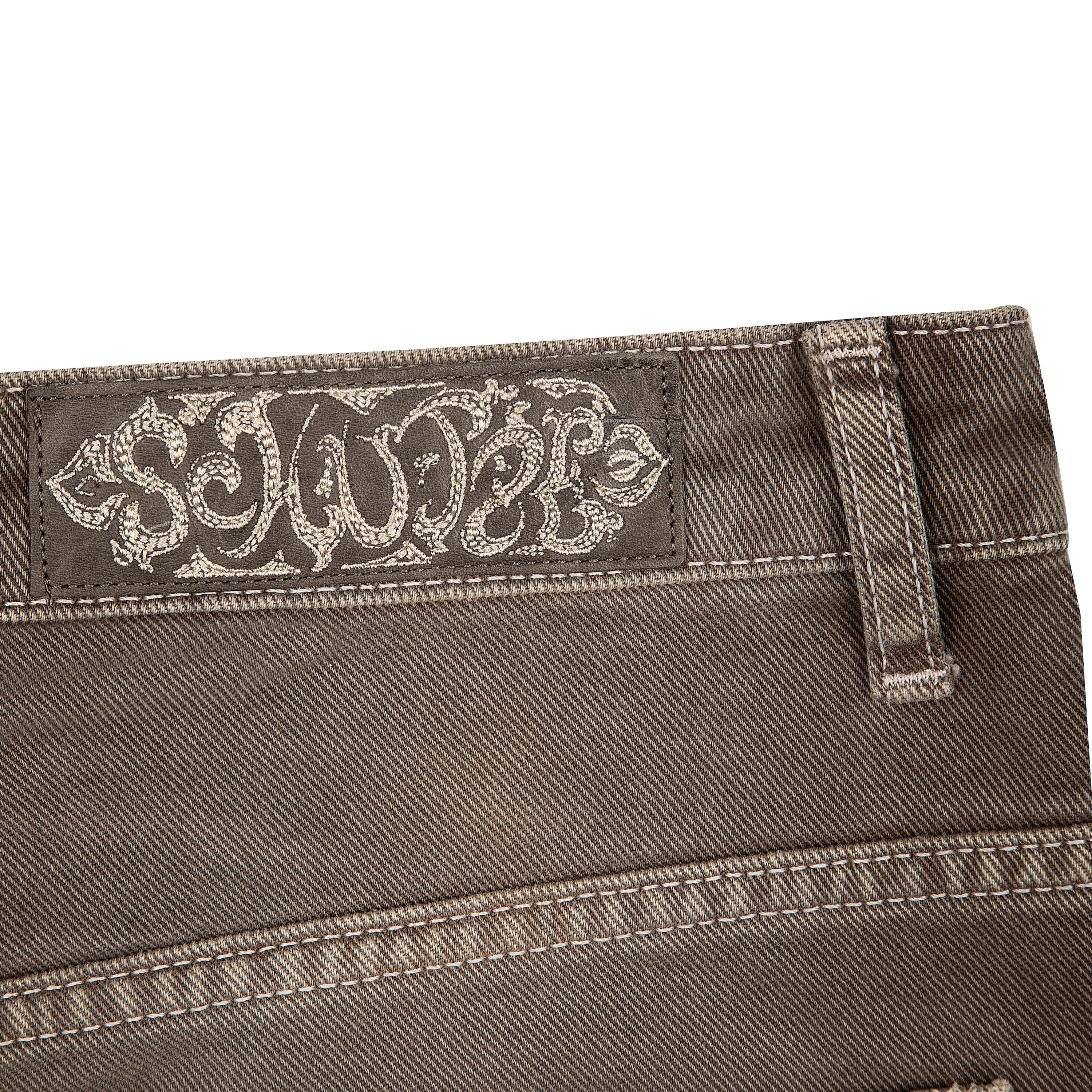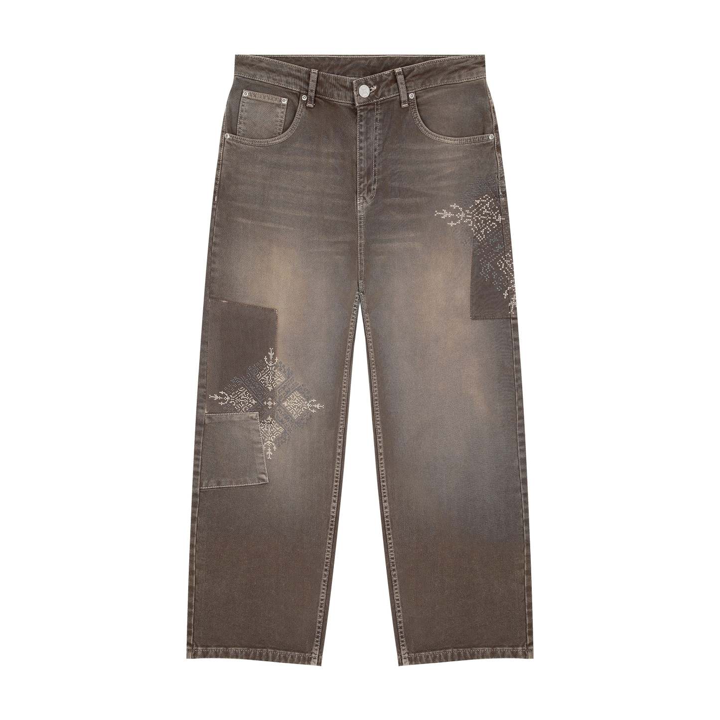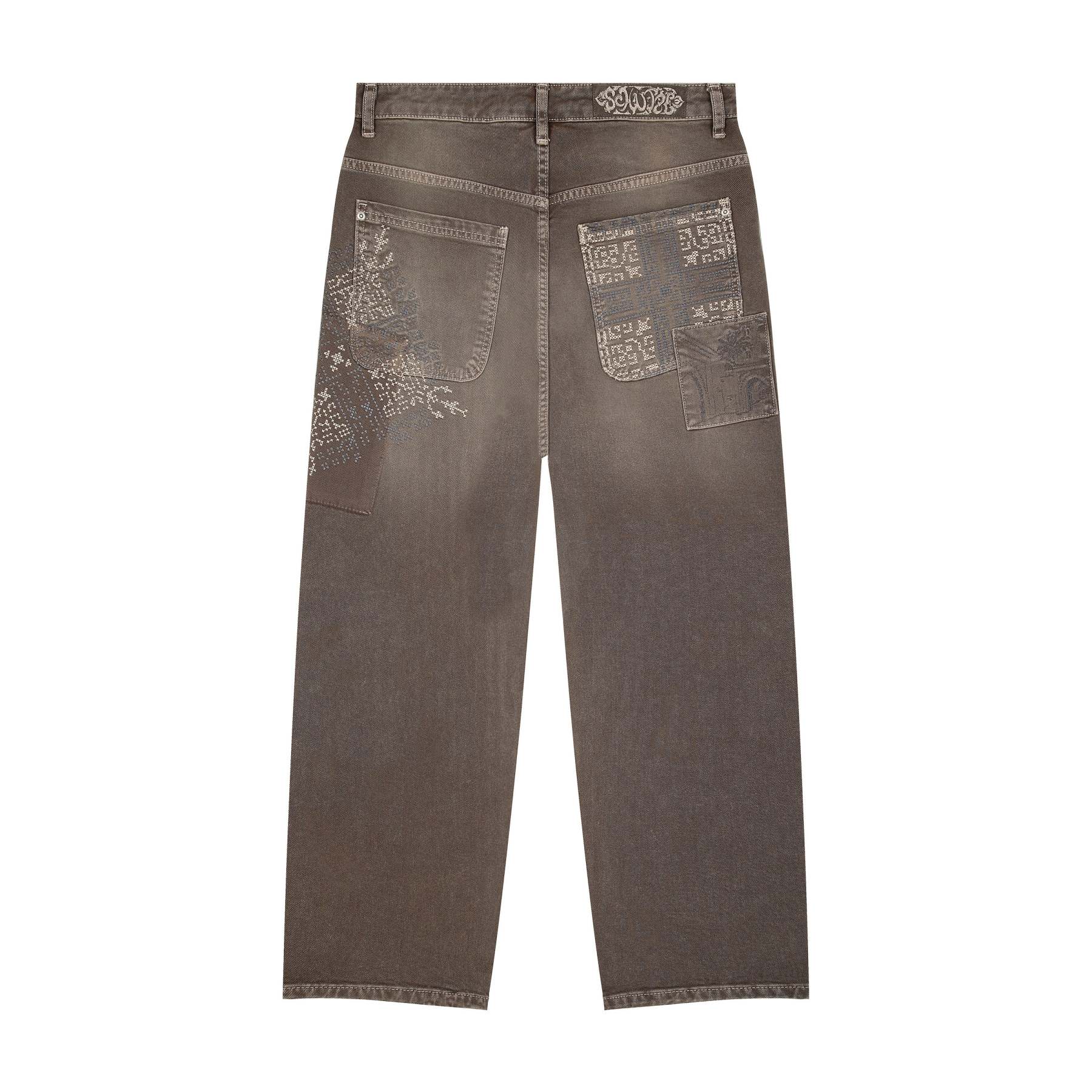14,5oz denim / 100% cotton / embroidery on front and back / patches on front and back / embroidered leather patch / custom button / brown washed effect / wash inside out / fits true to size