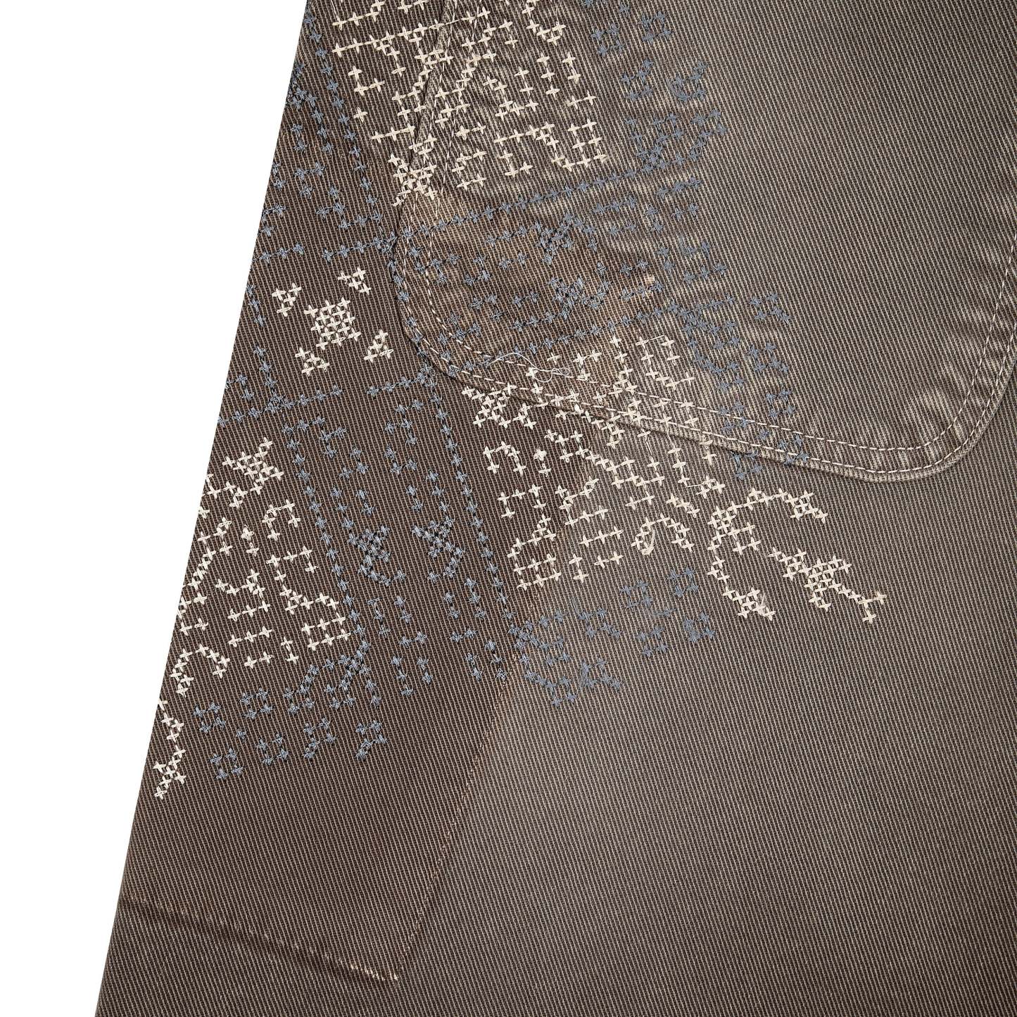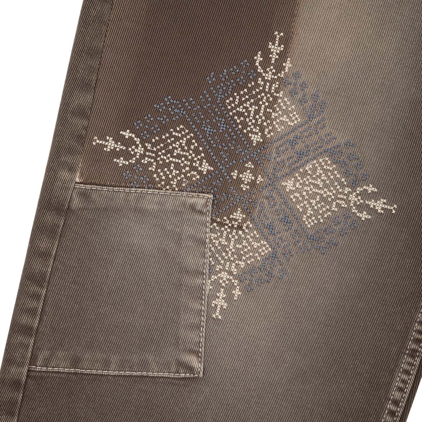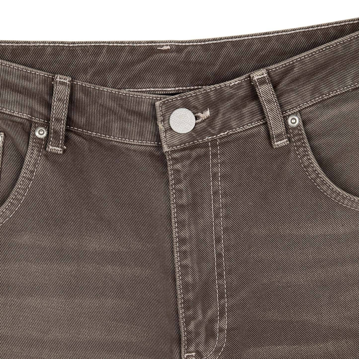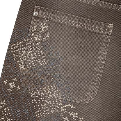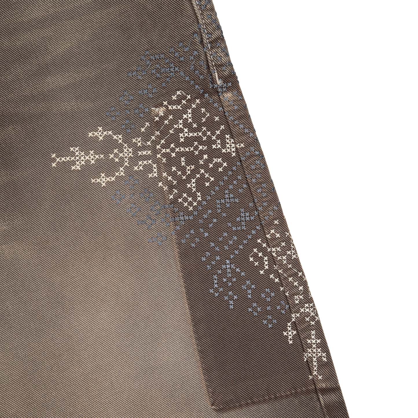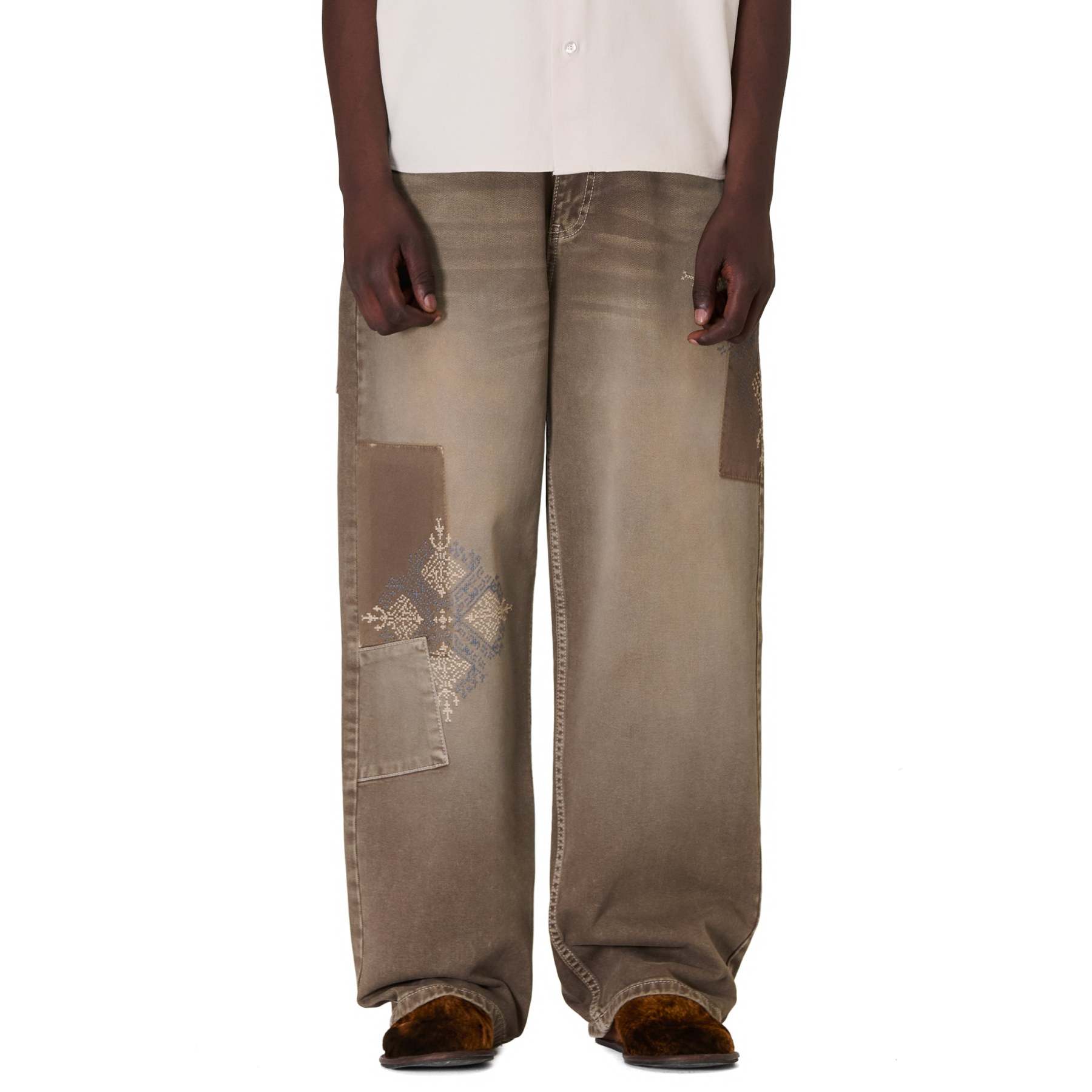 14,5oz denim / 100% cotton / embroidery on front and back / patches on front and back / embroidered leather patch / custom button / brown washed effect / wash inside out / fits true to size