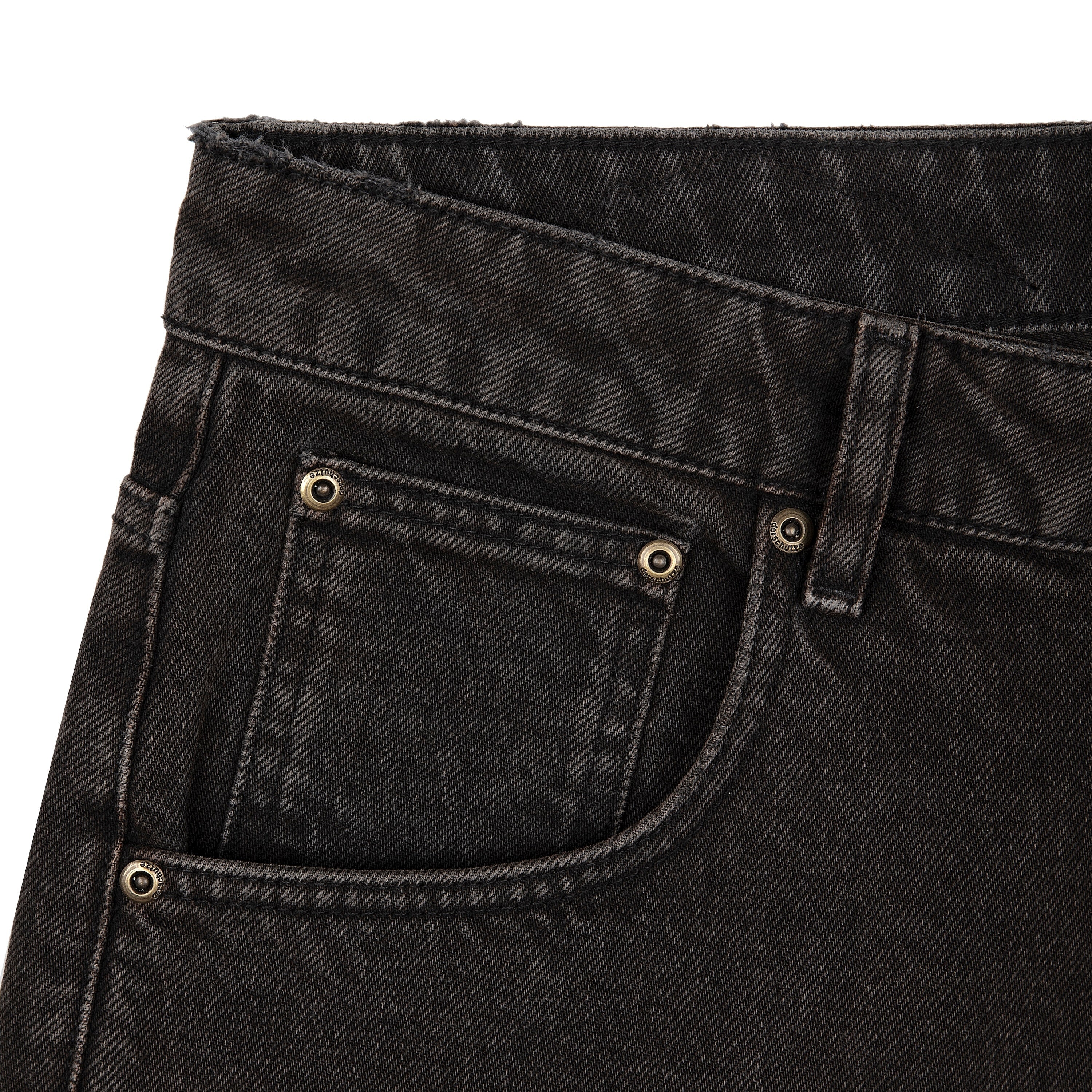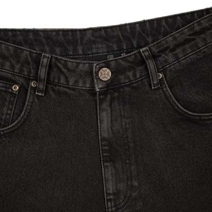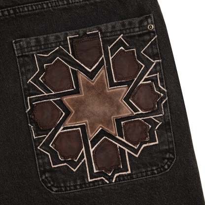 14,5oz denim / 100% cotton / genuine leather applique embroidery on back pocket / embroidered leather patch / custom button / brown washed effect / wash inside out / fits true to size