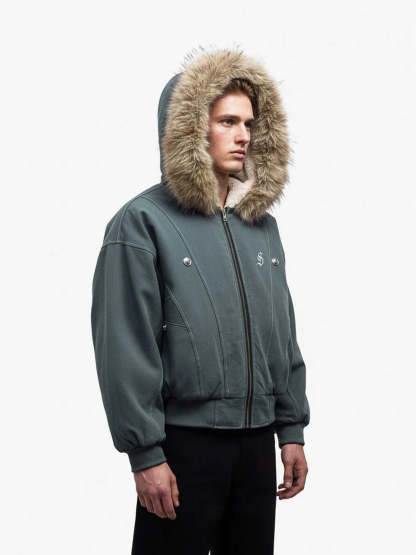 Faux Fur Lined Zip Up Winter Hooded Bomber Jacket - 2560