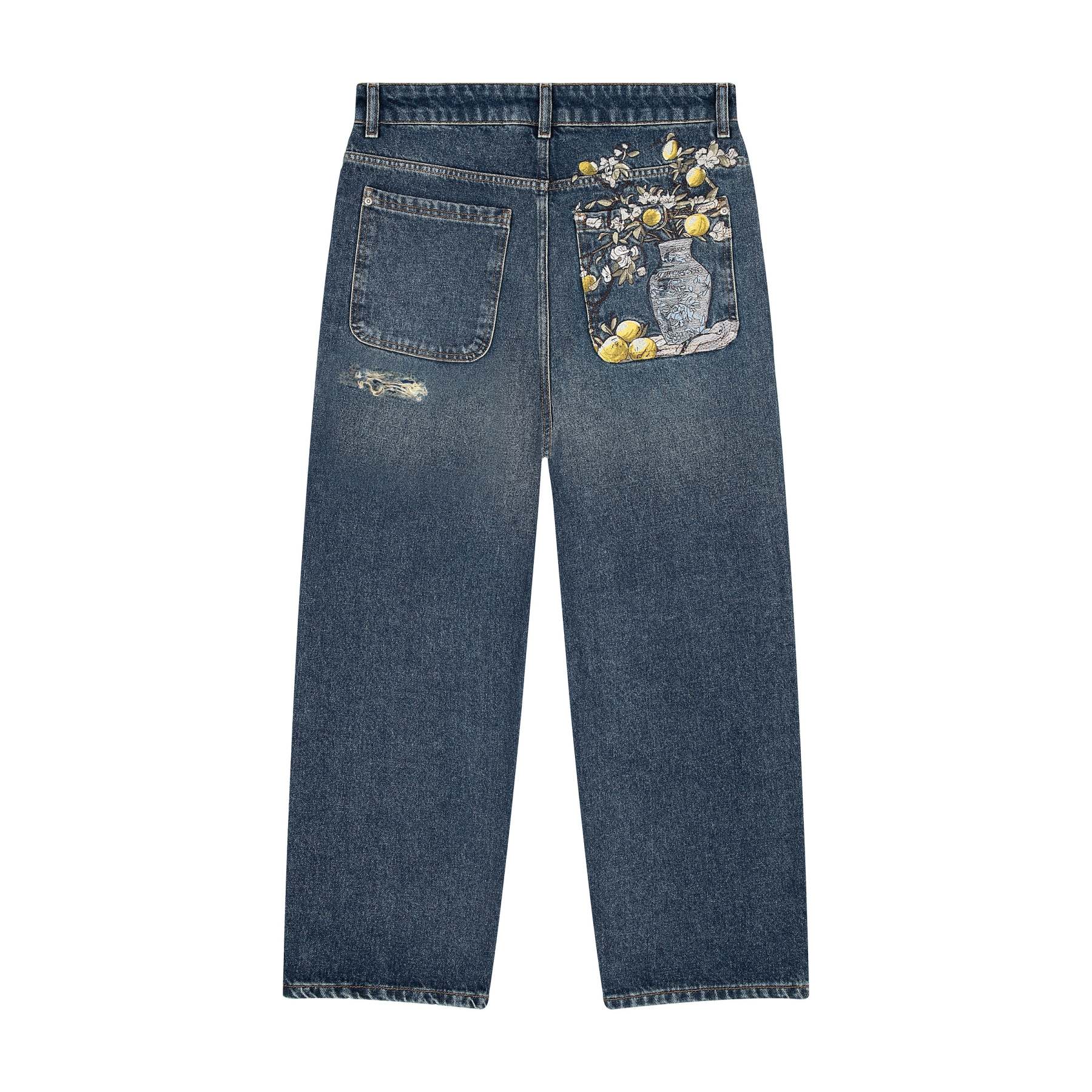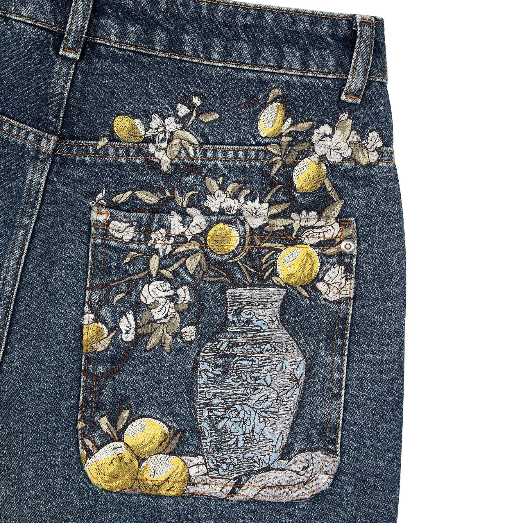 14,5oz denim / 100% cotton / embroidery on front and back / effect washing / distressing on front and back / custom button / baggy fit / fits true to size