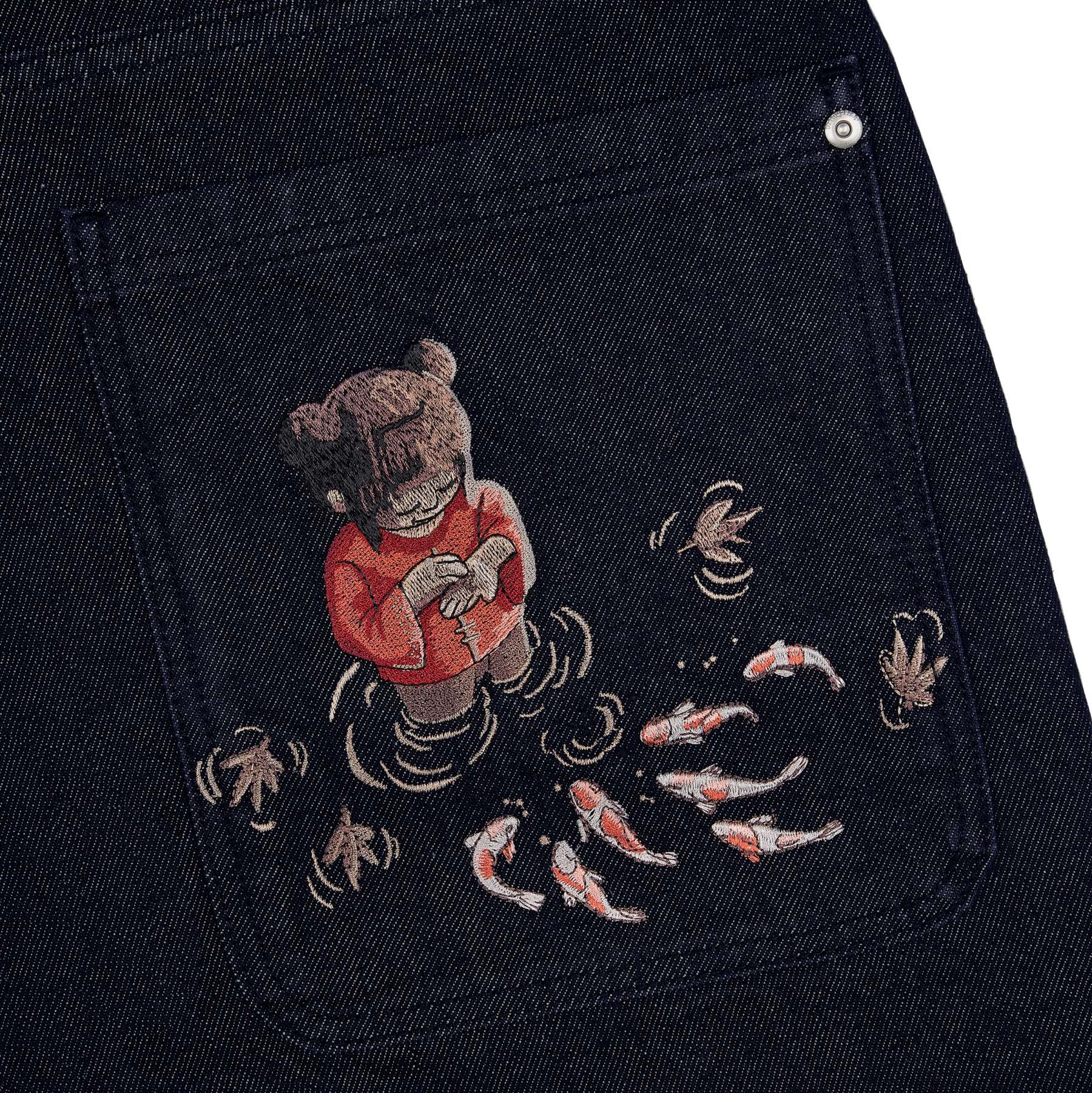14,5oz raw denim / 100% cotton / embroidery on front and back pocket / embroidered leather patch / wash inside out / fits true to size