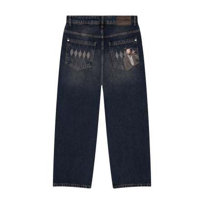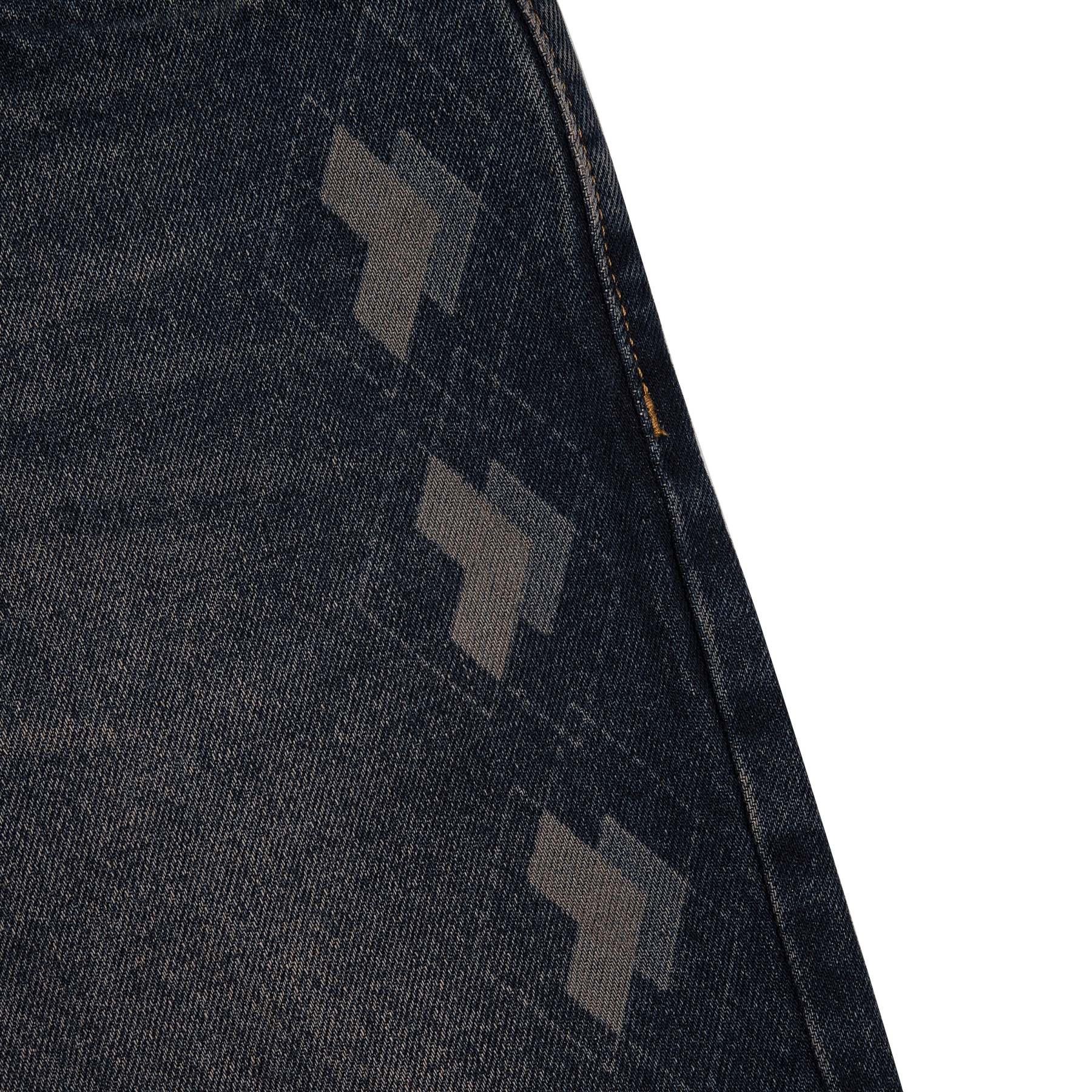 14,5oz denim / 100% cotton / laser printed plaid pattern details on front and back pockets / embroidery on back / deboss printed leather patch / effect washing / fits true to size