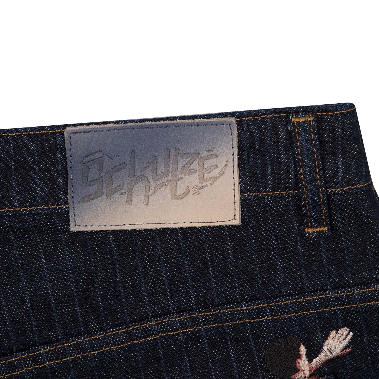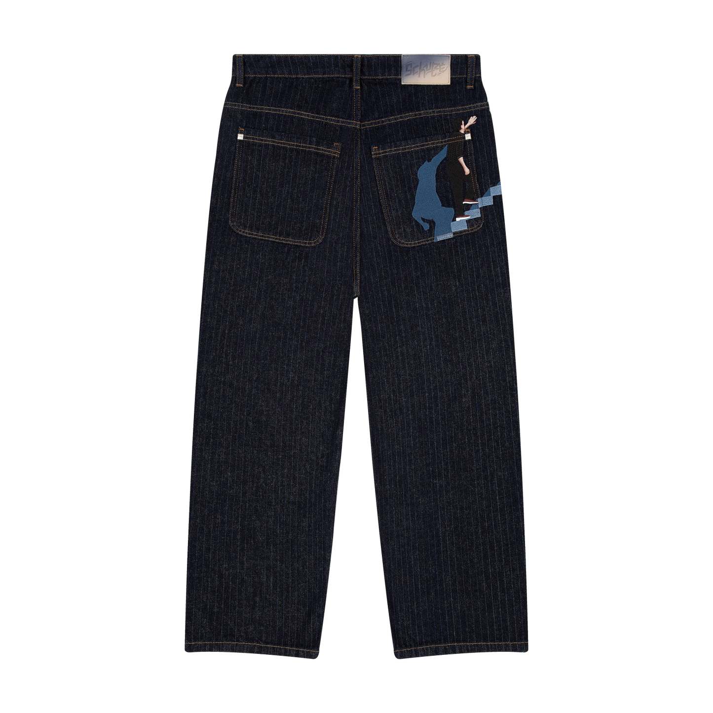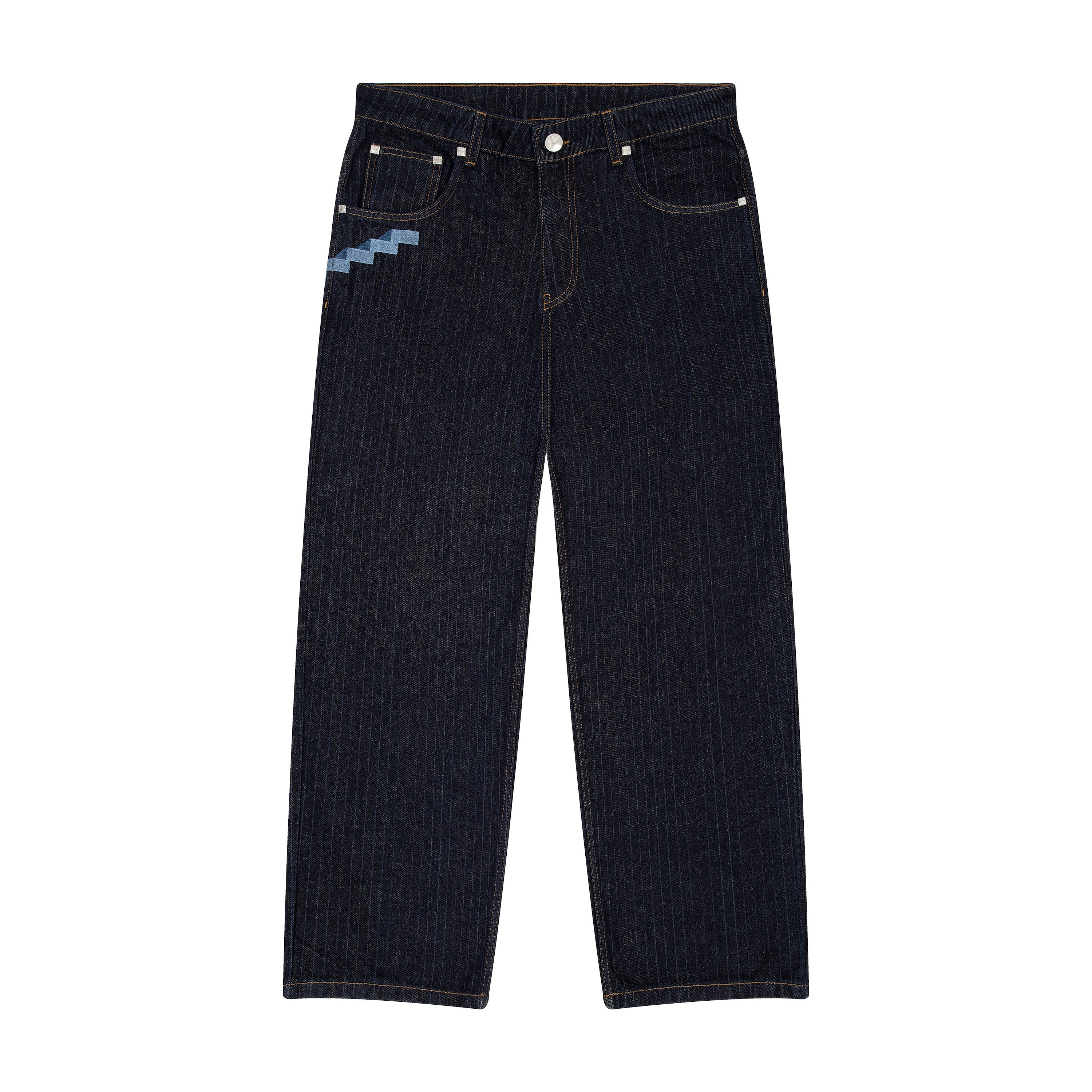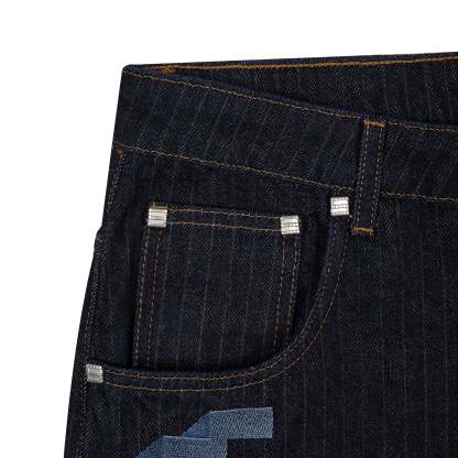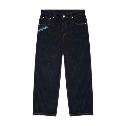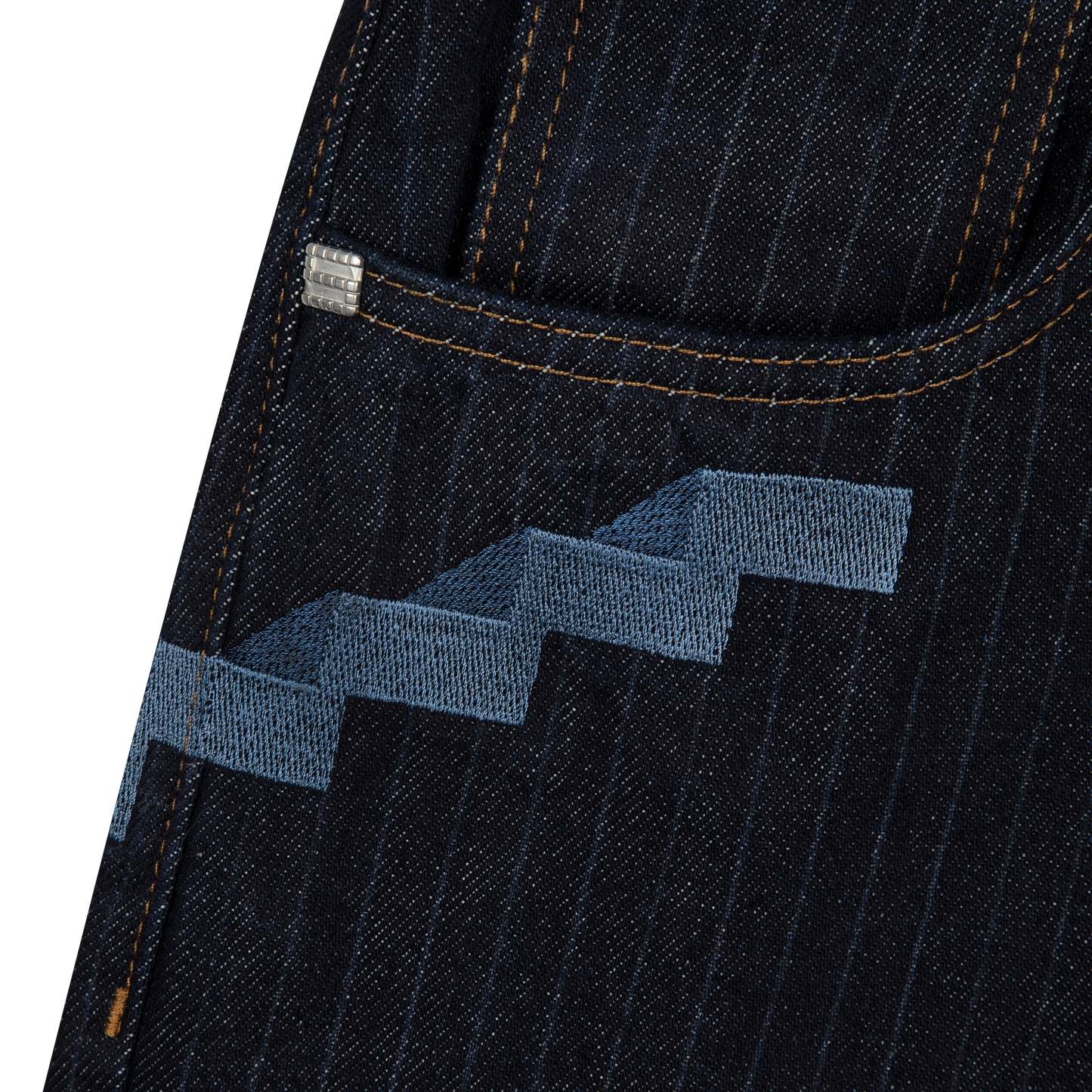 14,5oz raw denim / 100% cotton / laser printed stripes on front and back / embroidery on front and back / deboss printed leather patch / custom buttons / fabric may bleed or fade, wash inside out in cold water to preserve color and character / fits true to size