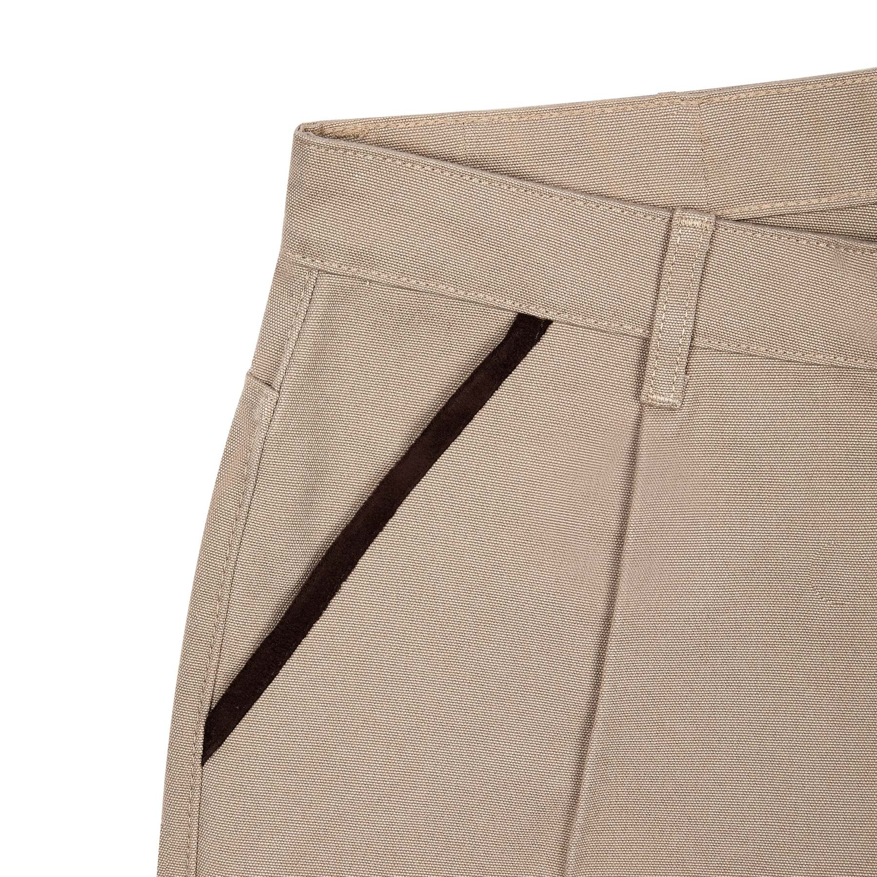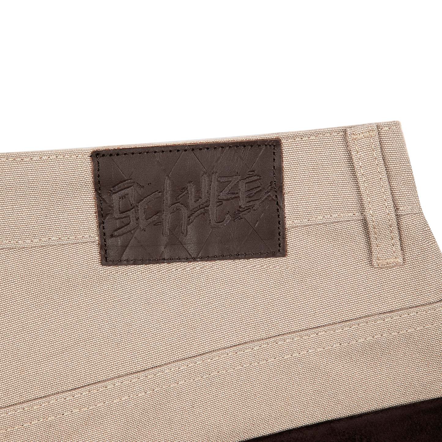 canvas fabric / 100% cotton / vegan suede leather details on front and back pocket openings / embroidery on back pocket / deboss printed leather patch / darts on front / custom button / fits true to size