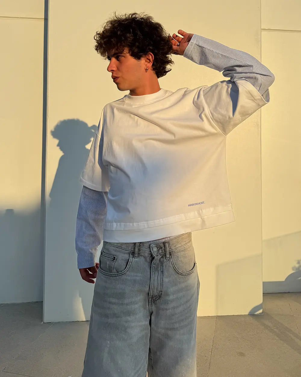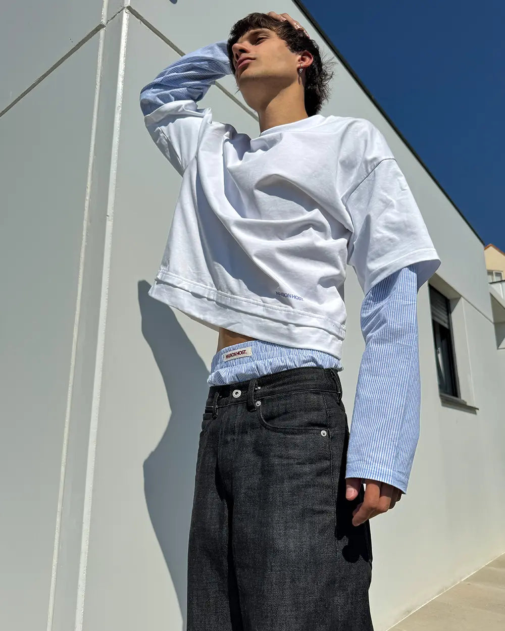 Features an inner shirt-fabric layer with blue stripes visible on the sleeves. Finished with a small MaisonHost® digital print on the lower right front.