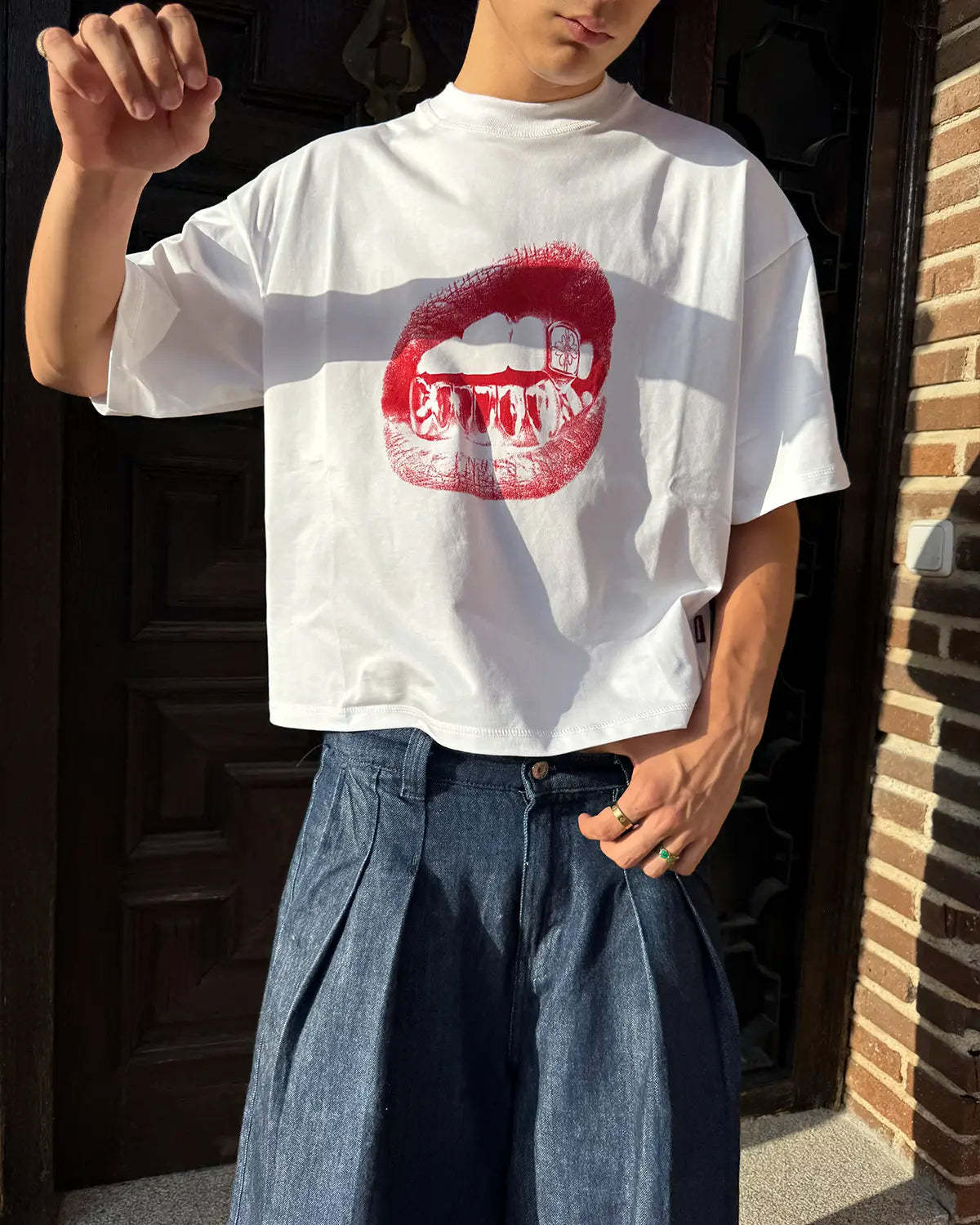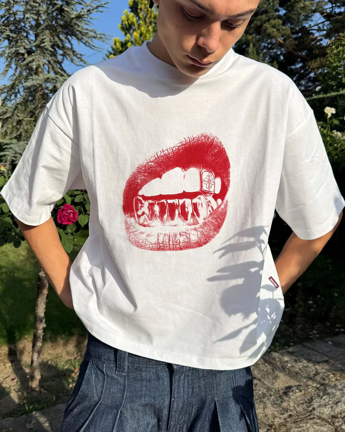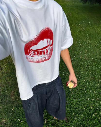 'Grillz Mouth' Red Digital Print front artwork.  'MAISONHOST®' cotton tag sewn on the left side of the T-shirt.