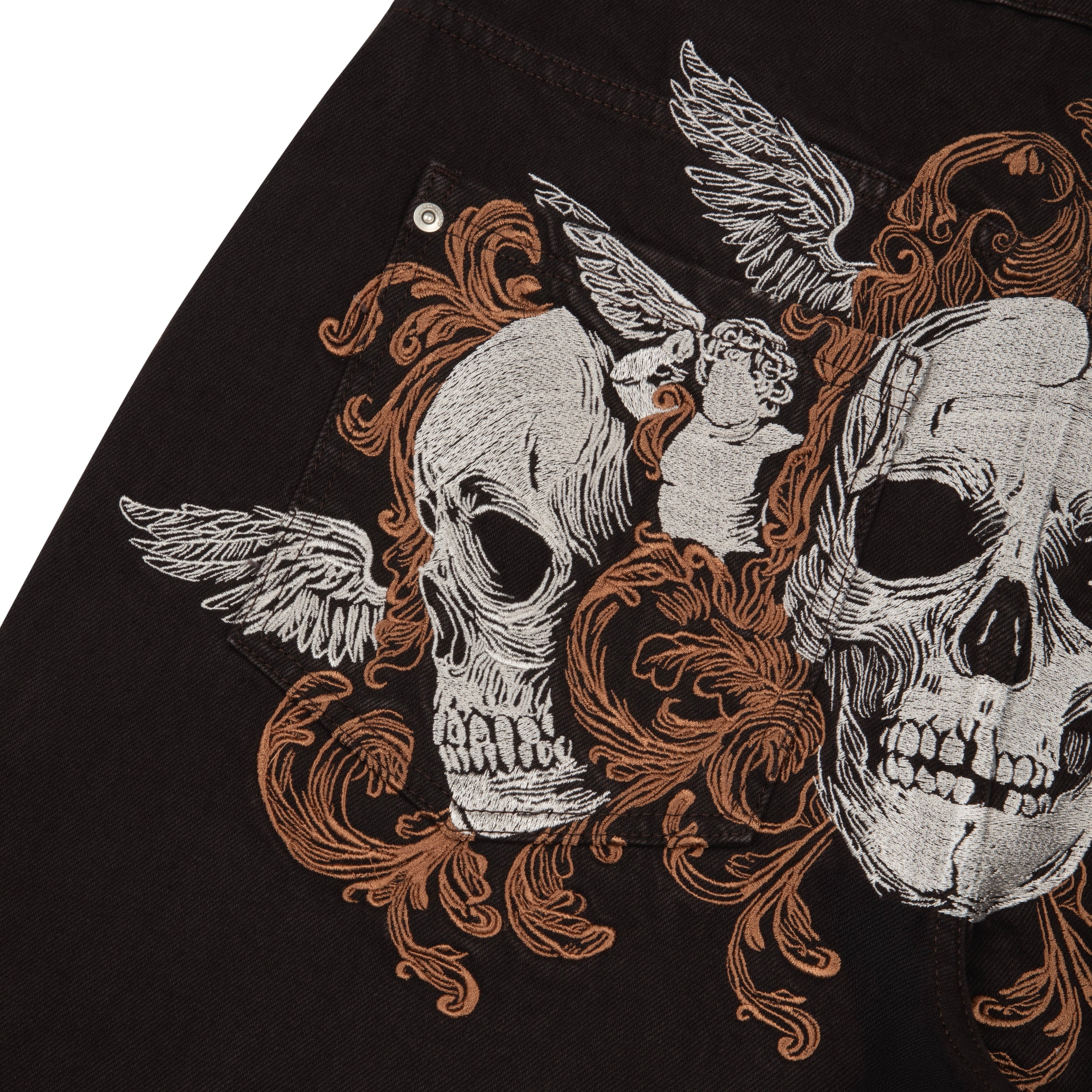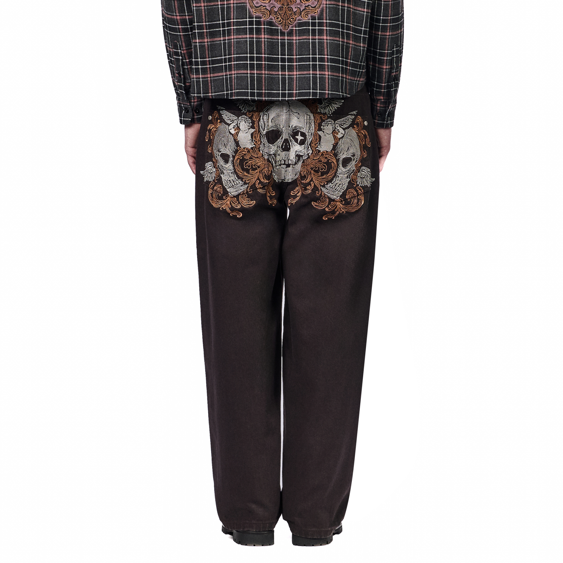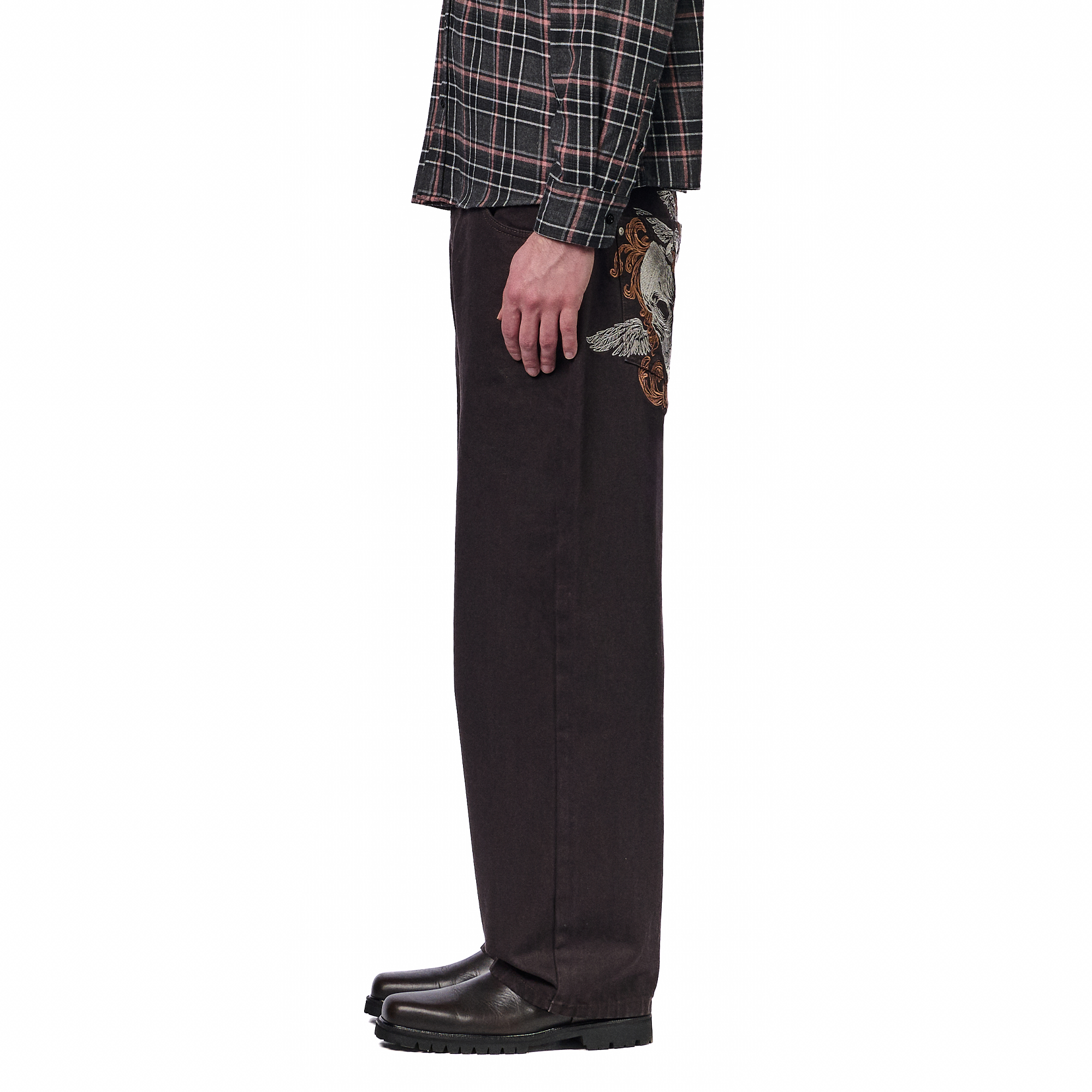 15oz denim / 100% cotton / embroidery on back / embroidered leather patch / wash inside out / balloon fit / fits true to size