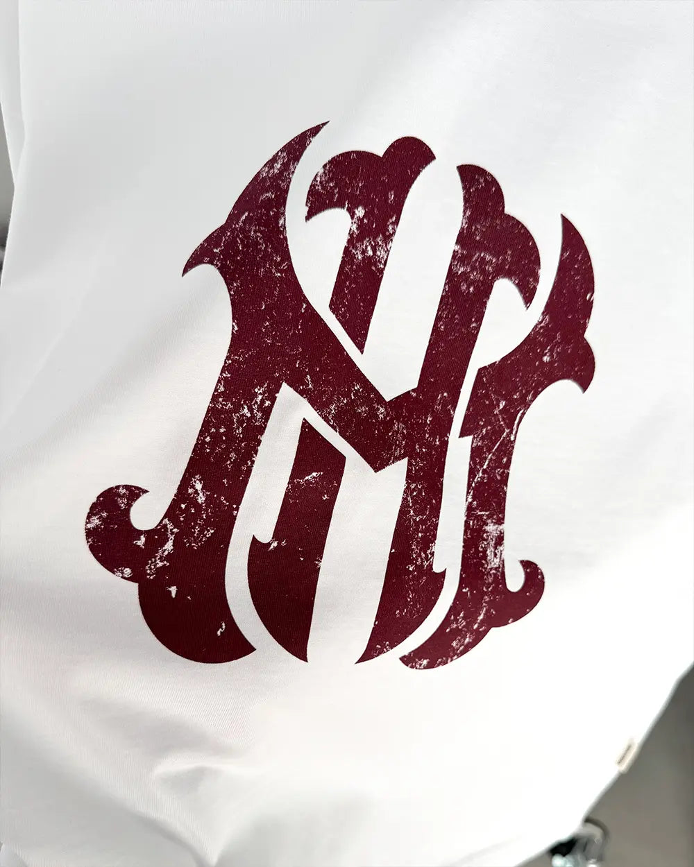 'MH' Burgundy Digital Print front artwork.  'MAISONHOST®' cotton tag sewn on the left side of the T-shirt.