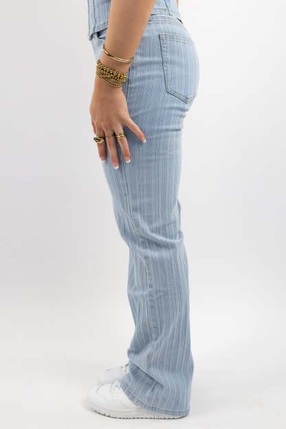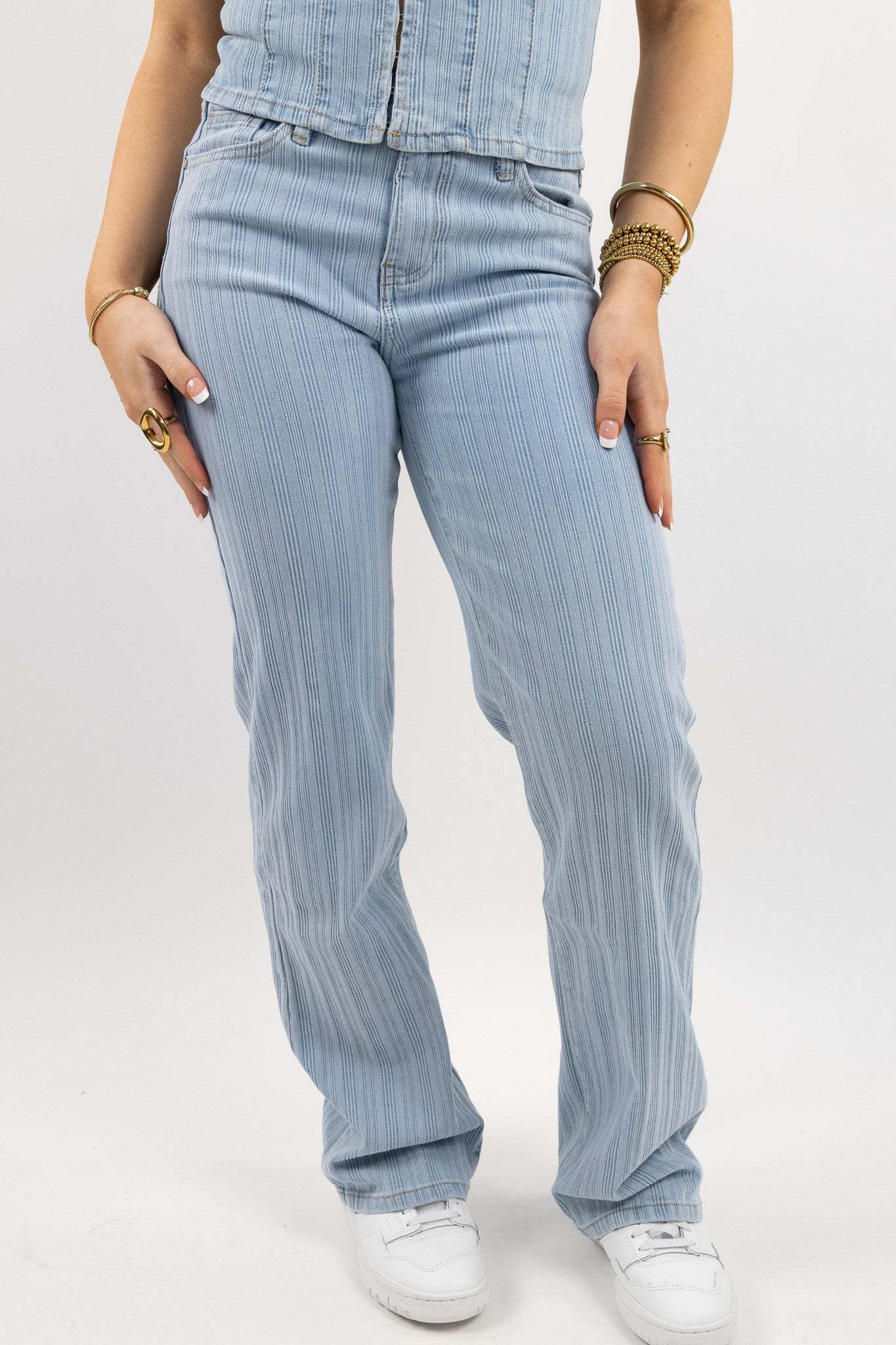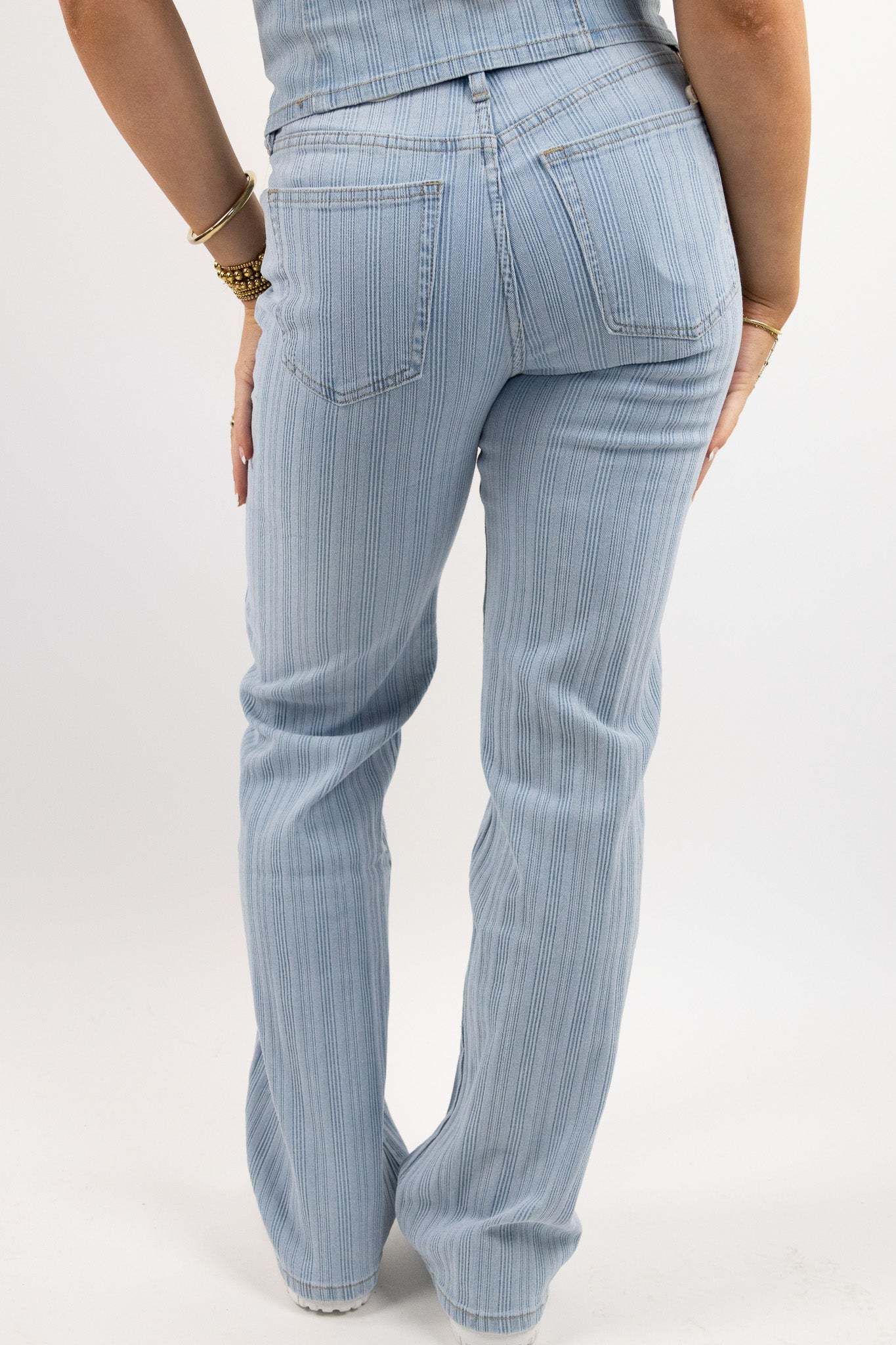 The Indira straight leg jeans are a total must-have for your wardrobe! They feature a straight leg fit and denim stripes for that extra touch.