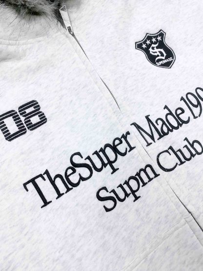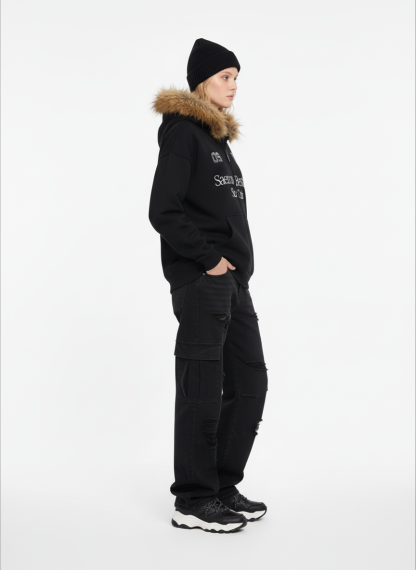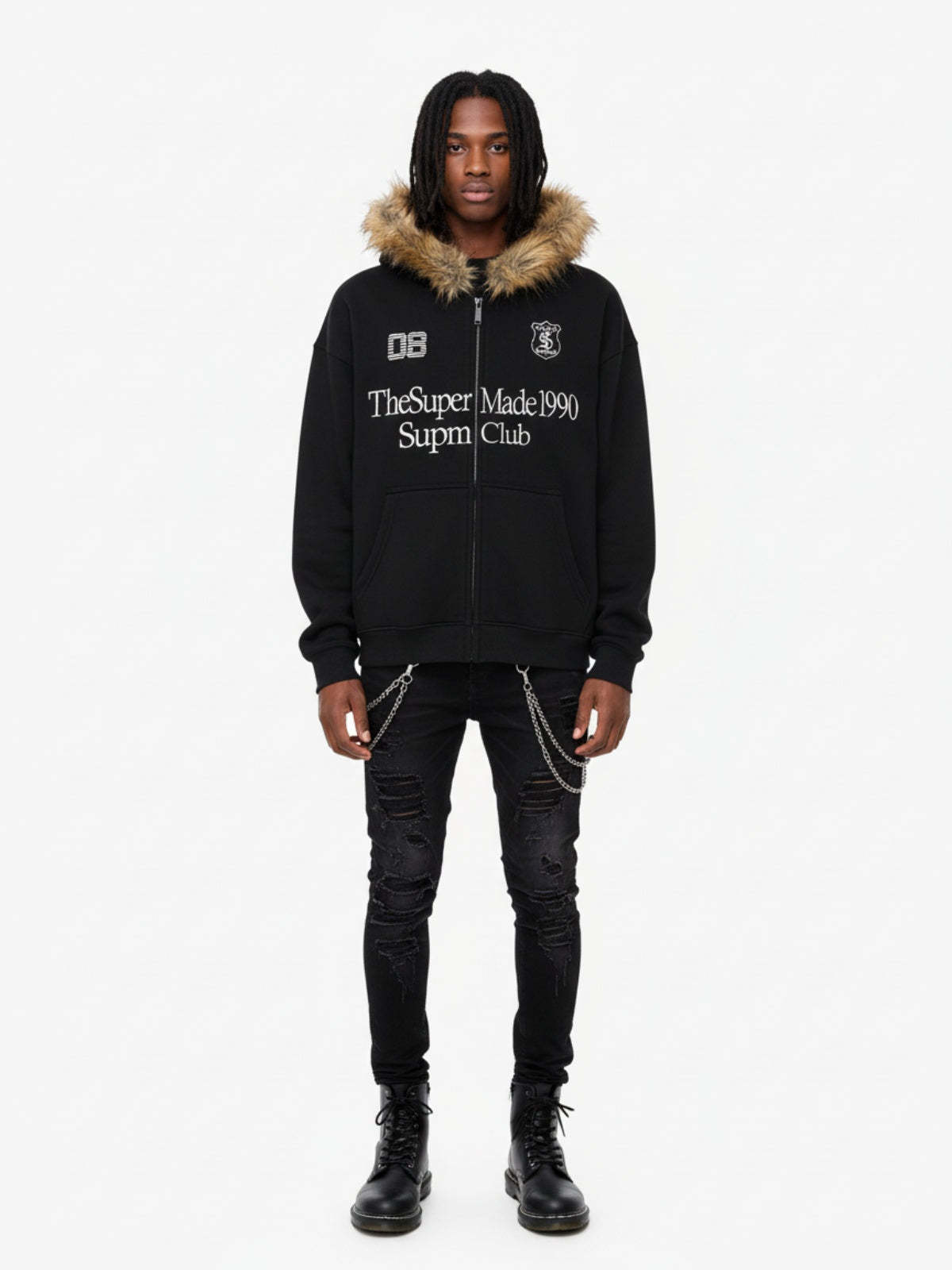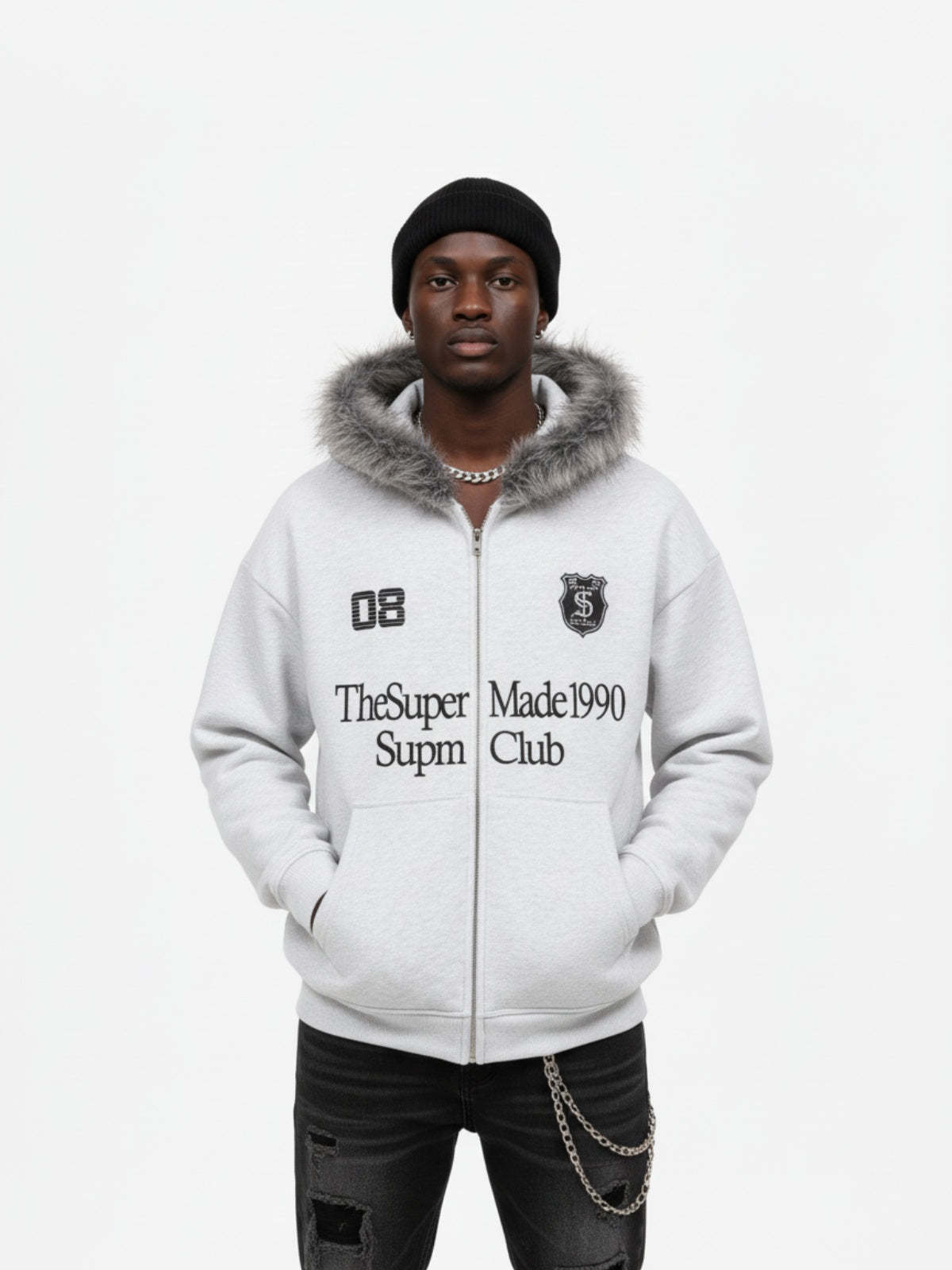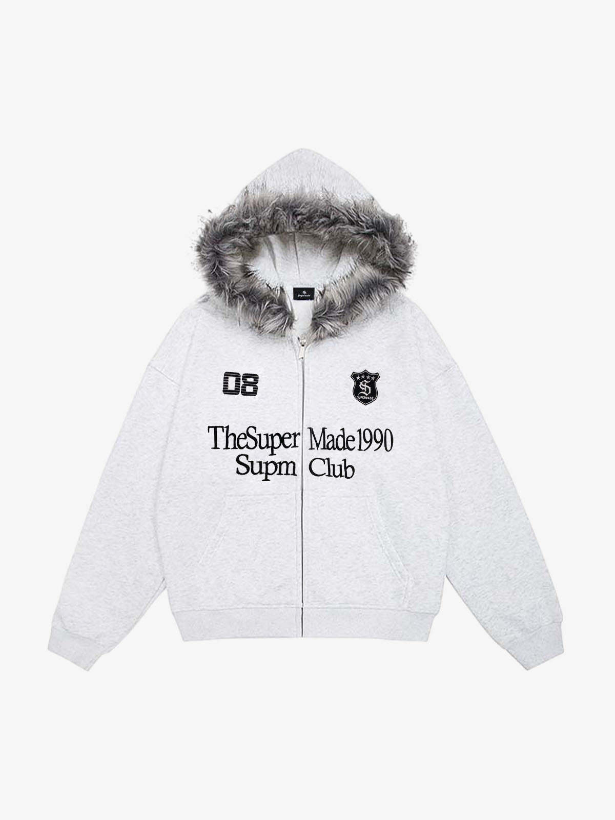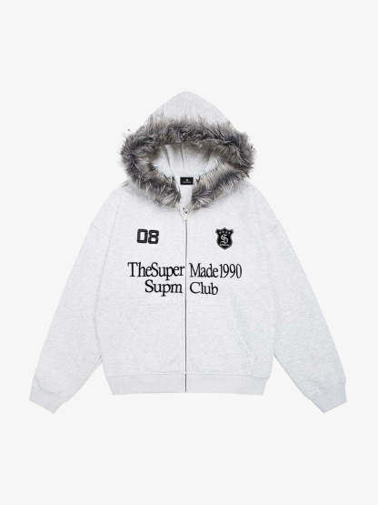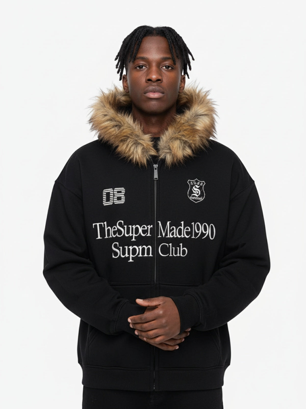 • Design Elements: Embroidered text details, faux fur-lined hood, front zipper closure