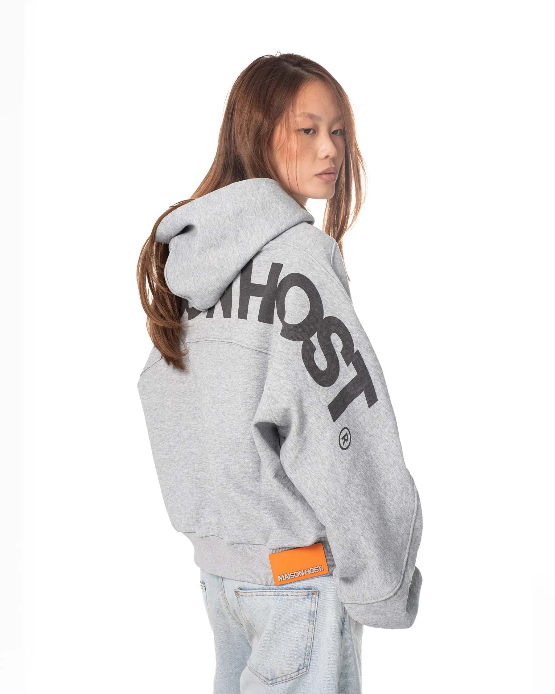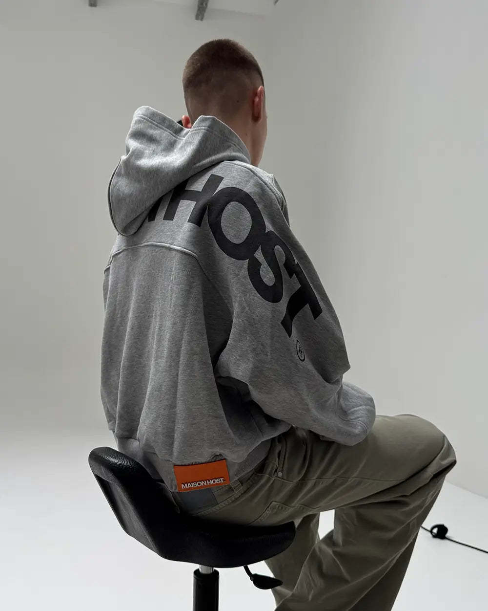 Features a large MAISON HOST® curved print running from the left sleeve across the back to the right sleeve, creating a continuous arc-shaped graphic. Finished with an orange leather patch on the back waist, detailed with metallic MAISONHOST® lettering embedded into the leather.