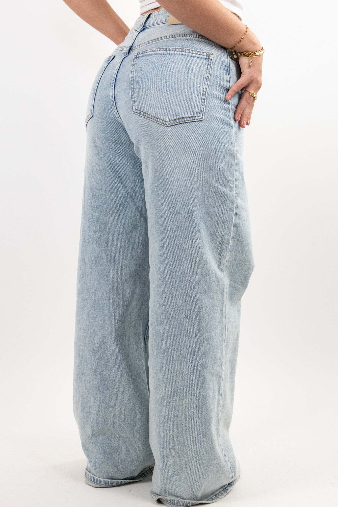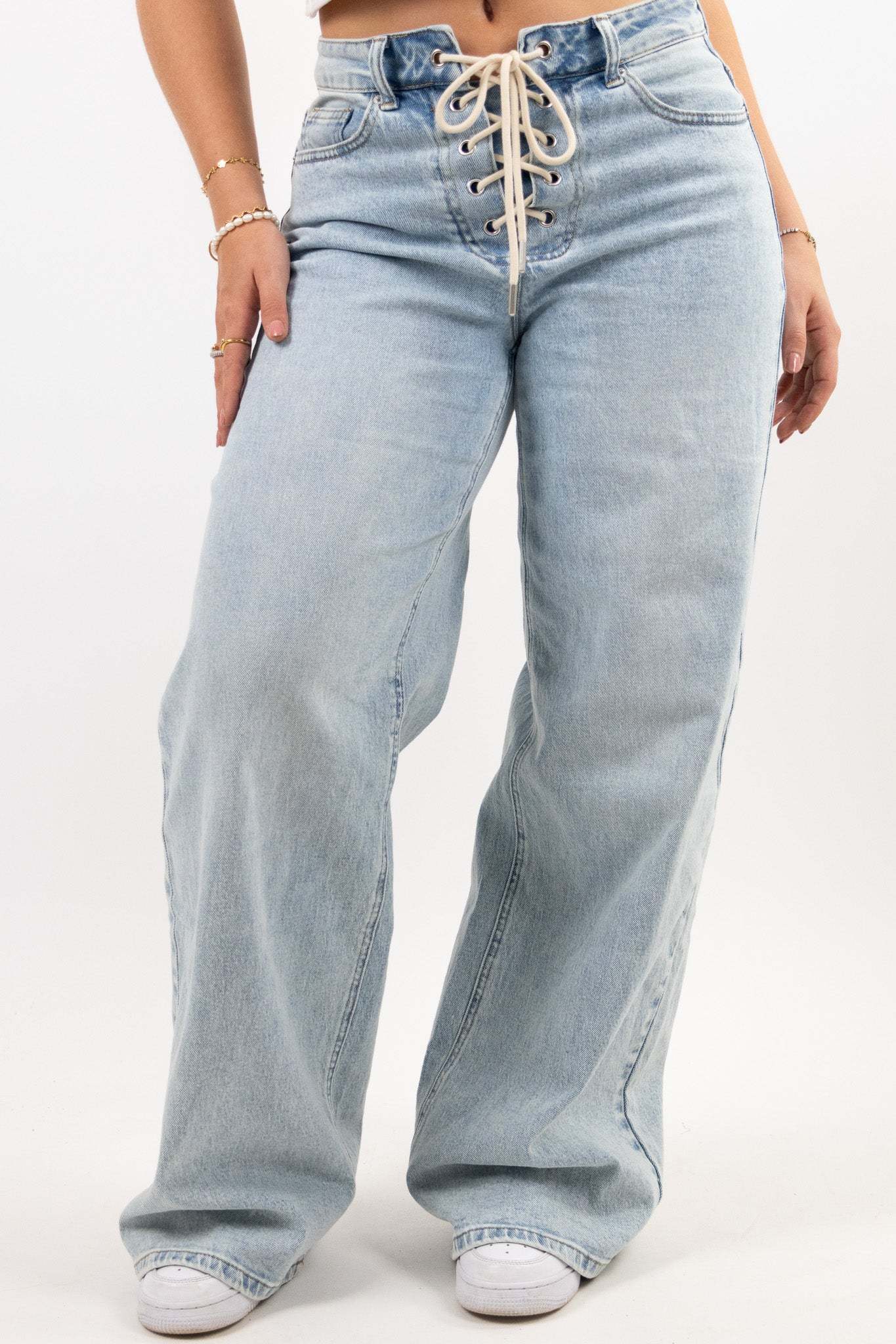 This unique denim features an eye-catching lace-up detail with thick rope laces. The baggy fit and light wash give your outfit an effortless, laid-back vibe, perfect for sunny days by the water or a casual city stroll.
