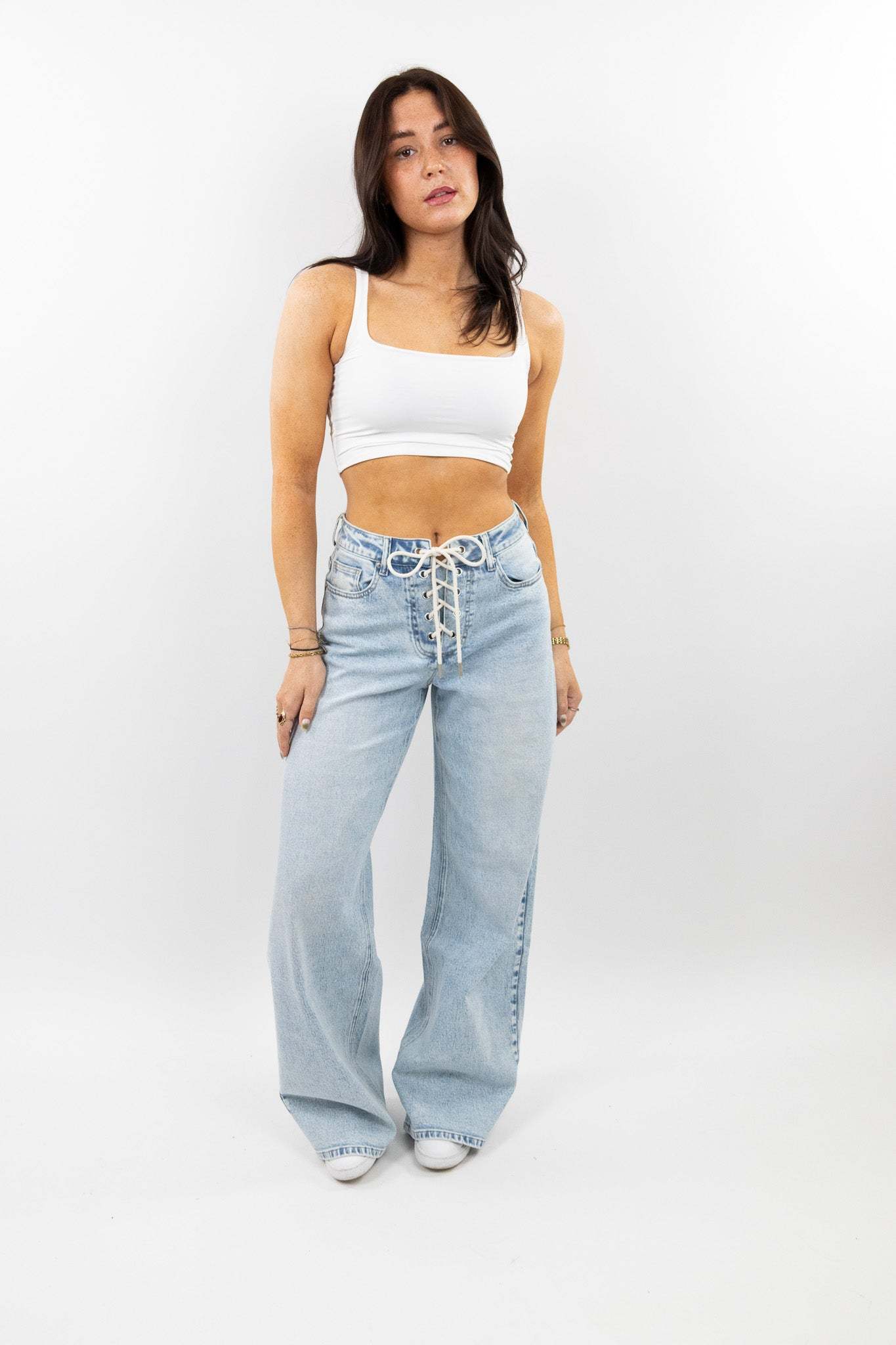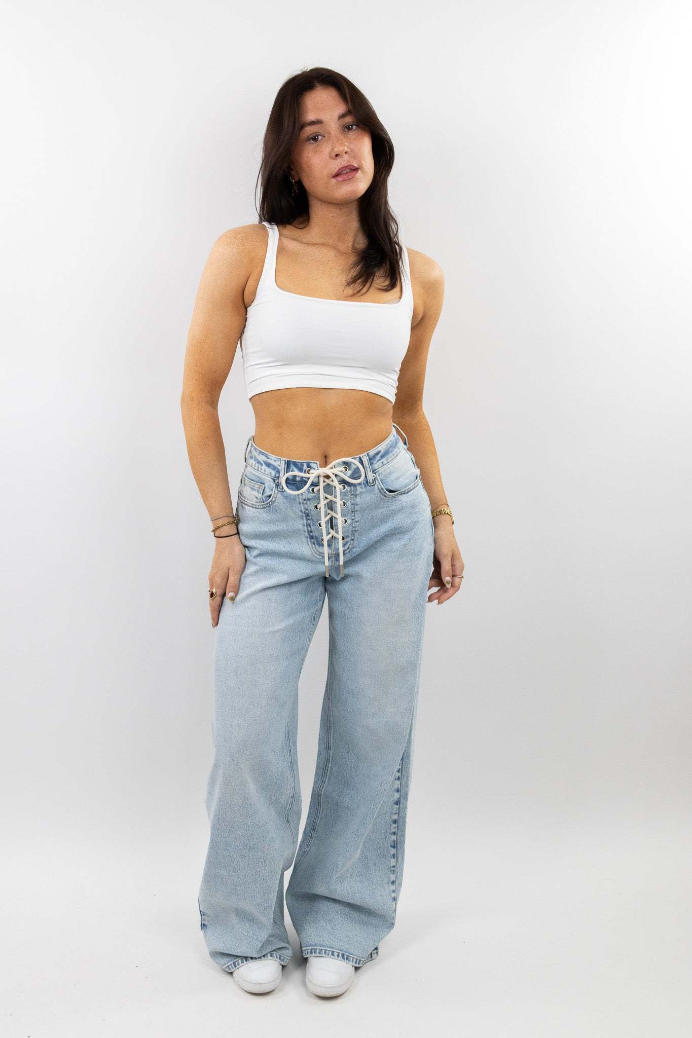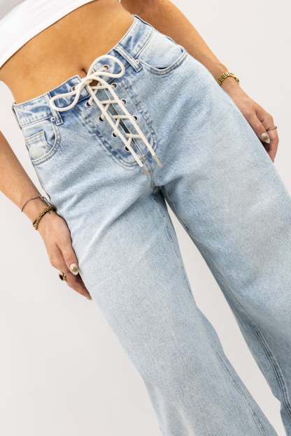 This unique denim features an eye-catching lace-up detail with thick rope laces. The baggy fit and light wash give your outfit an effortless, laid-back vibe, perfect for sunny days by the water or a casual city stroll.