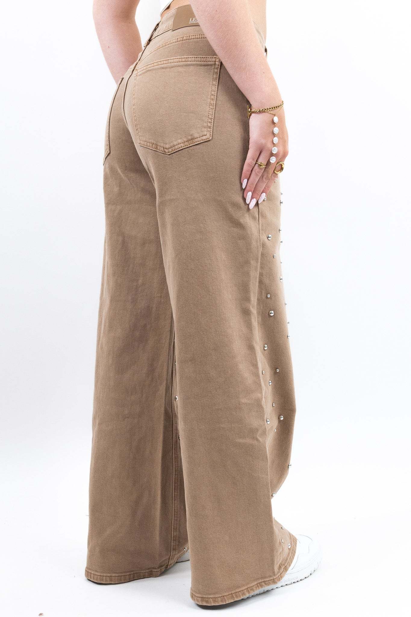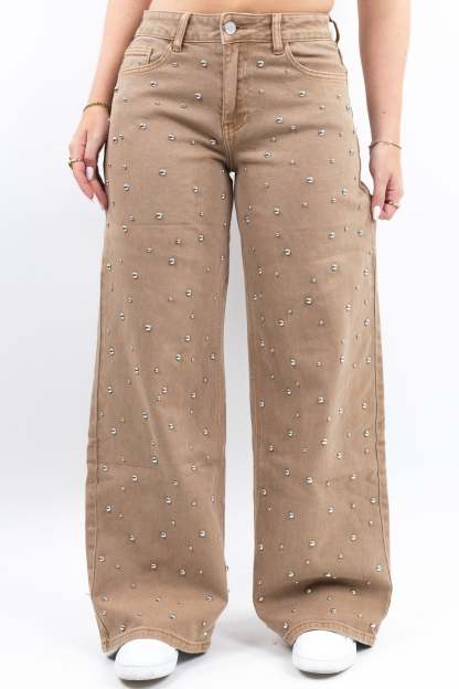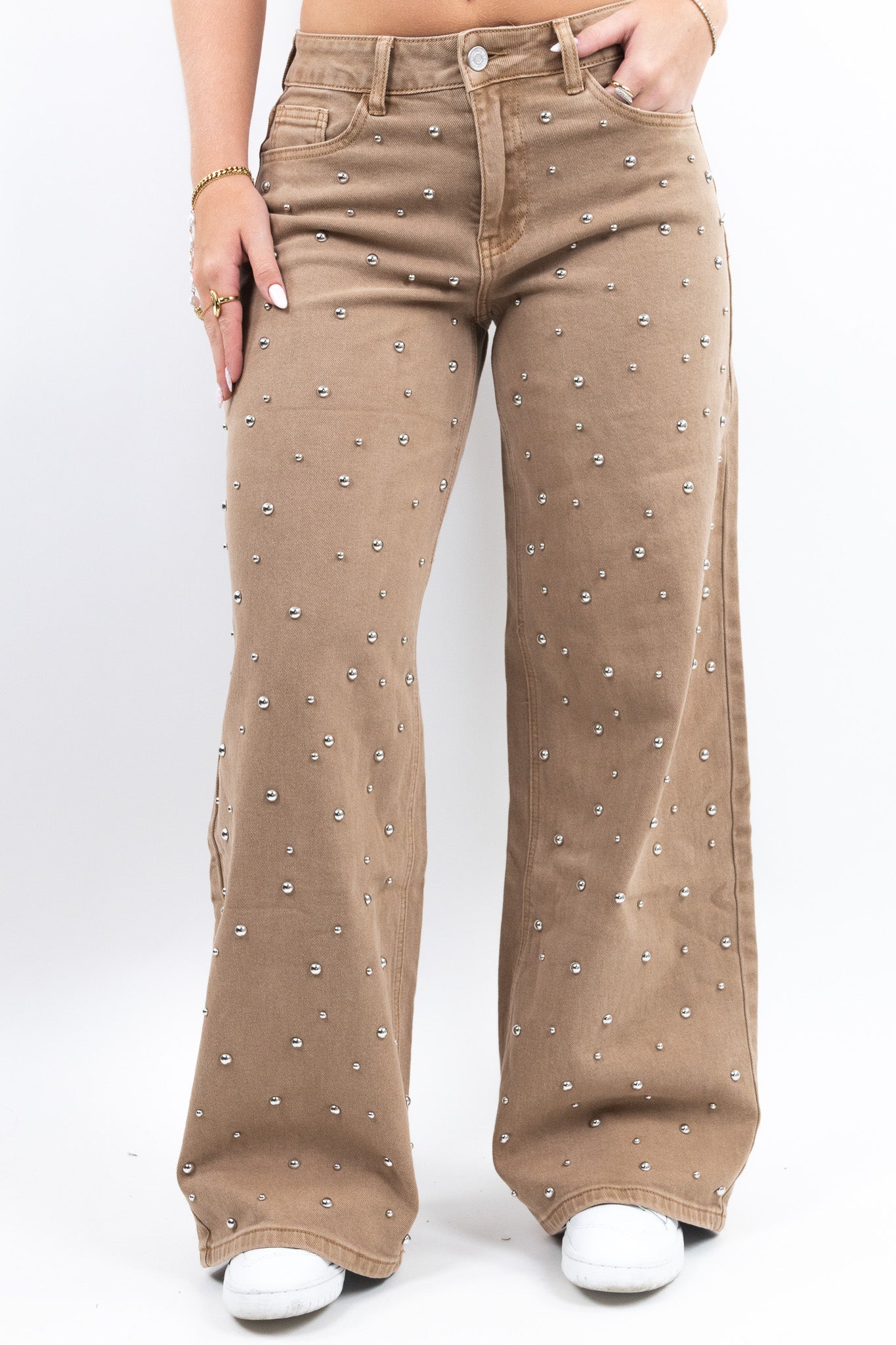 Make a statement with our Studded Baggy Jeans, the perfect mix of edgy and chic. These mid-waist jeans feature a relaxed wide-leg fit and are fully adorned with silver studs that create a bold, standout look. The sturdy denim adds structure, while the wide legs give a flattering and comfortable silhouette.