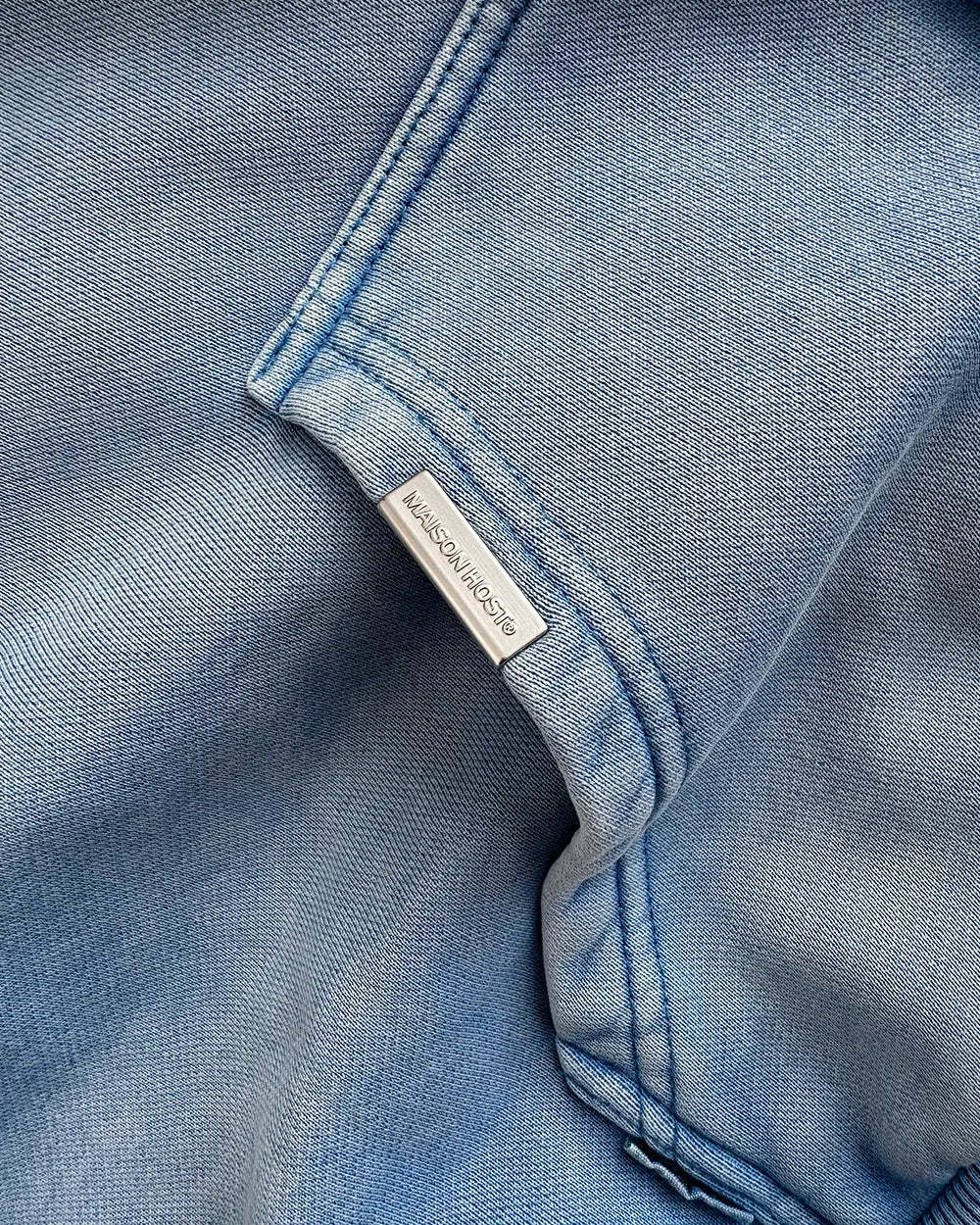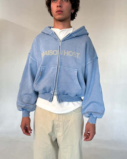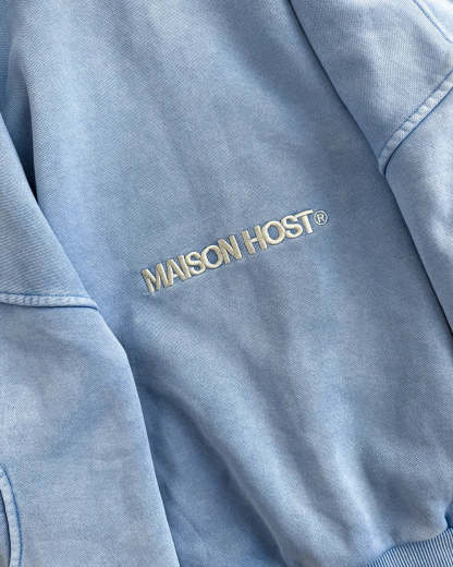 Signature Wavy Arms curved sleeve construction. Double metal zipper engraved with MAISONHOST®, front print and tonal back embroidery.