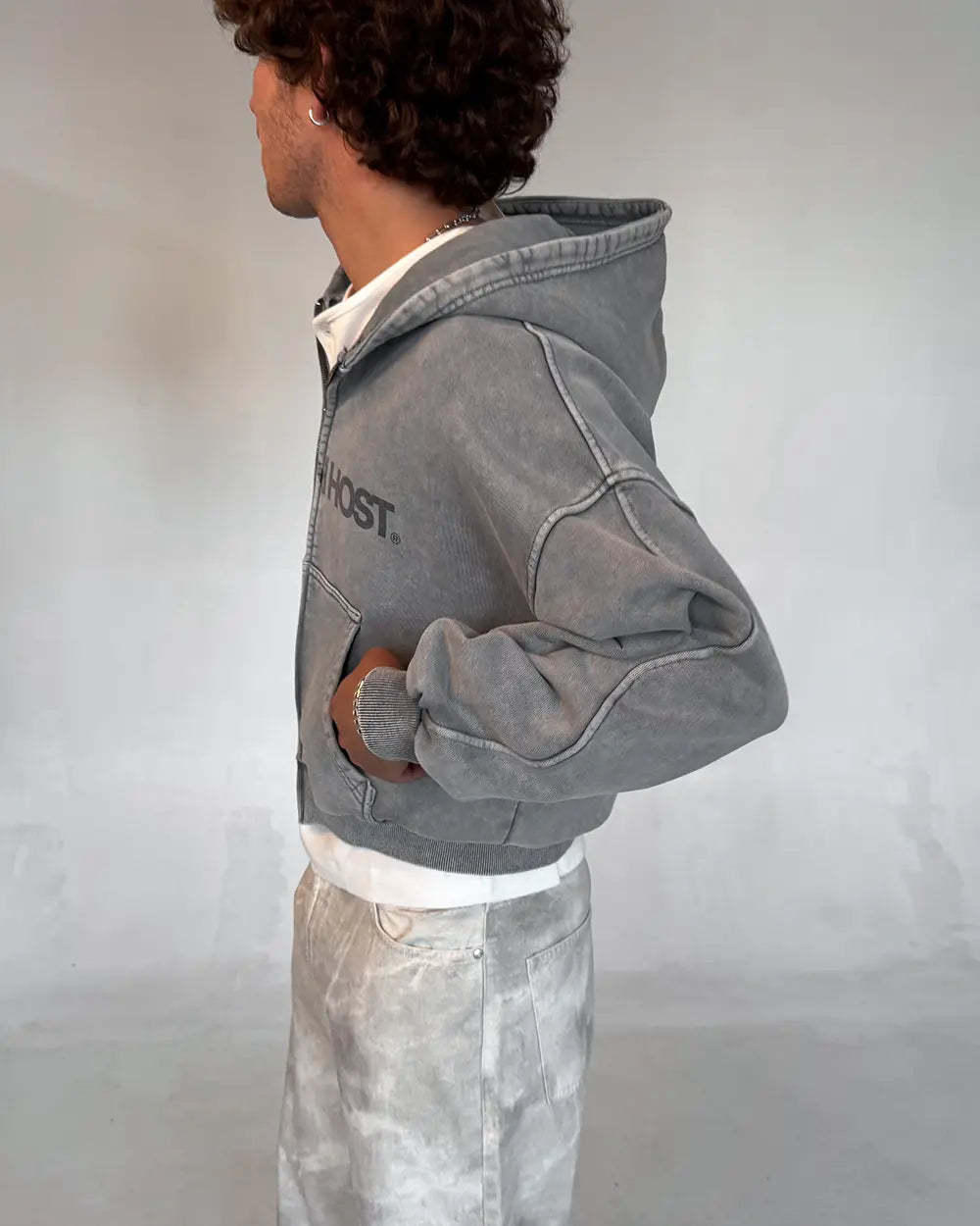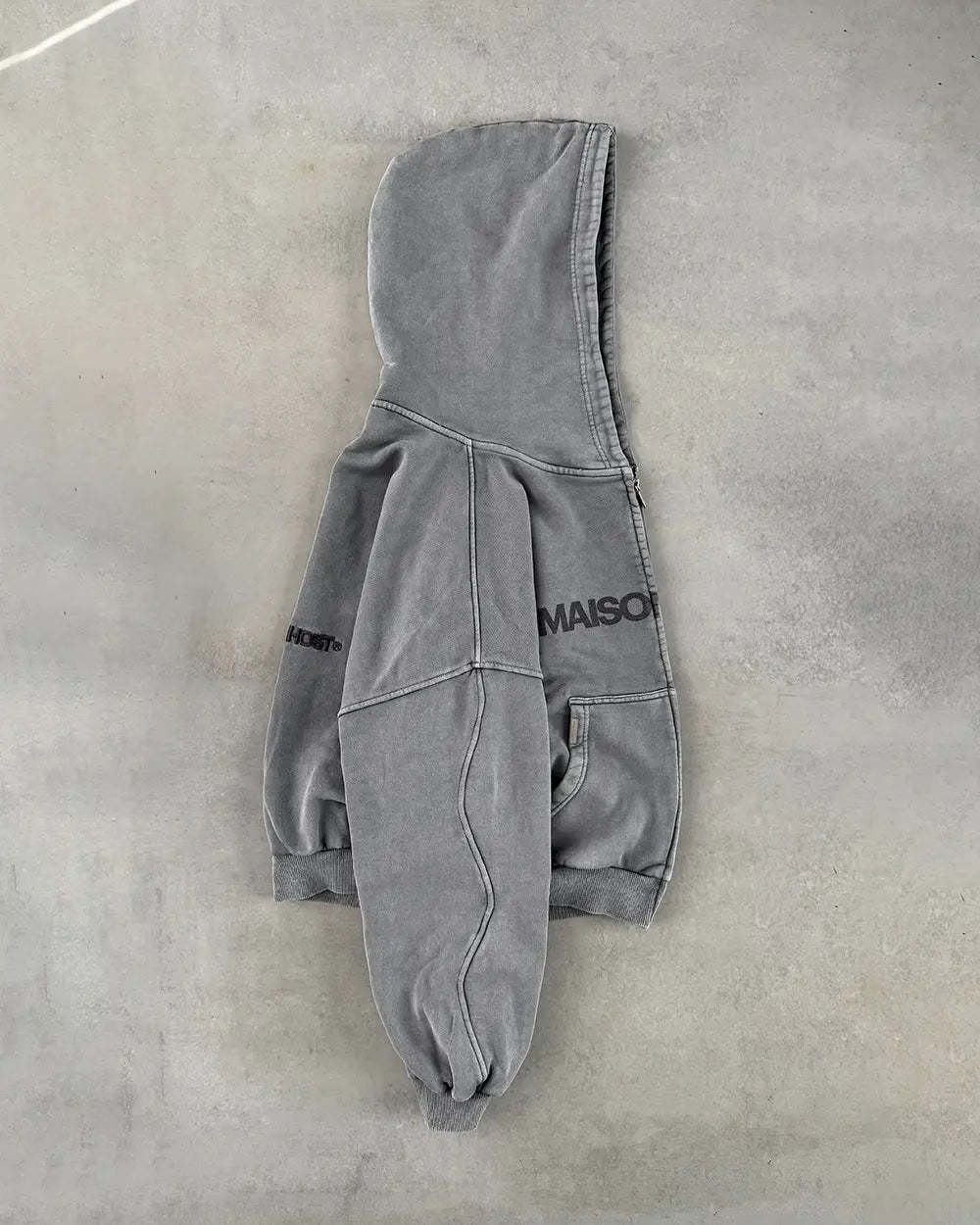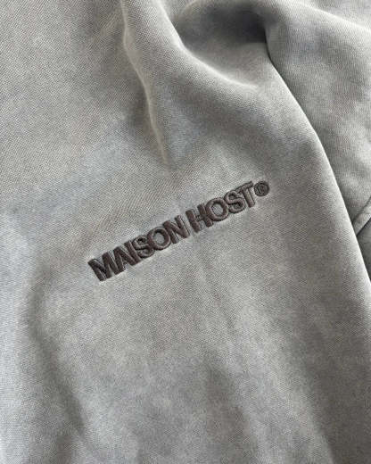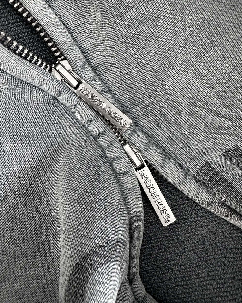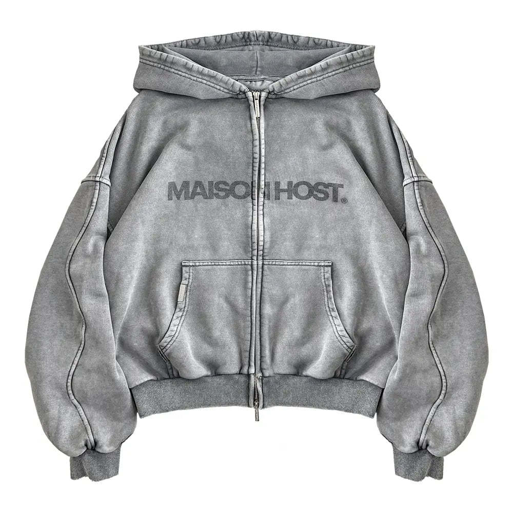 Signature Wavy Arms curved sleeve construction. Double metal zipper engraved with MAISONHOST®, front print and tonal back embroidery.