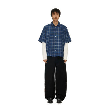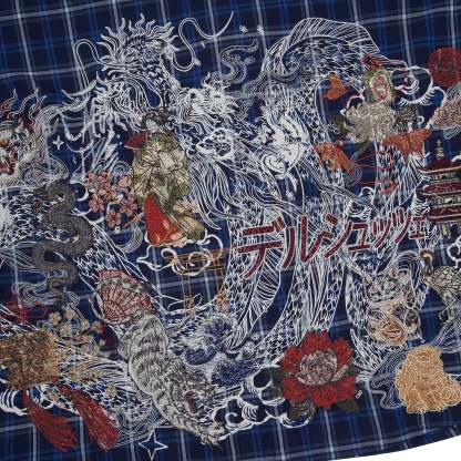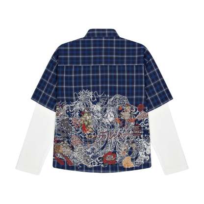 plaid popeline fabric / 100% cotton / waffle sleeves (100% cotton) / embroidery on back / custom buttons / curved hem / relaxed fit / fits true to size
