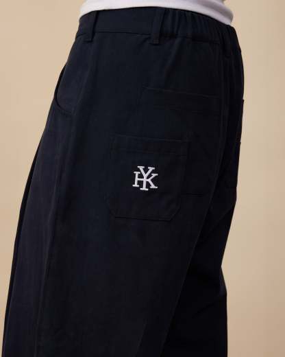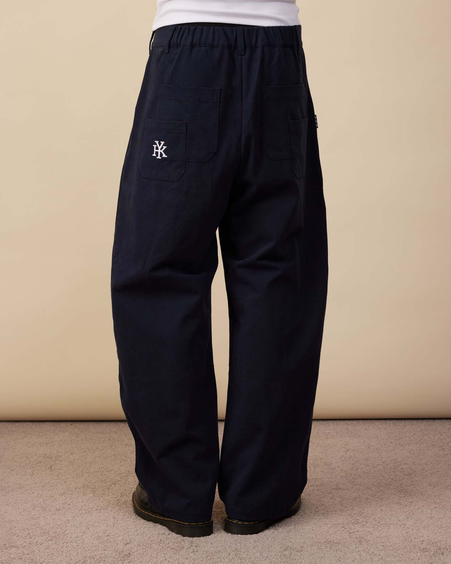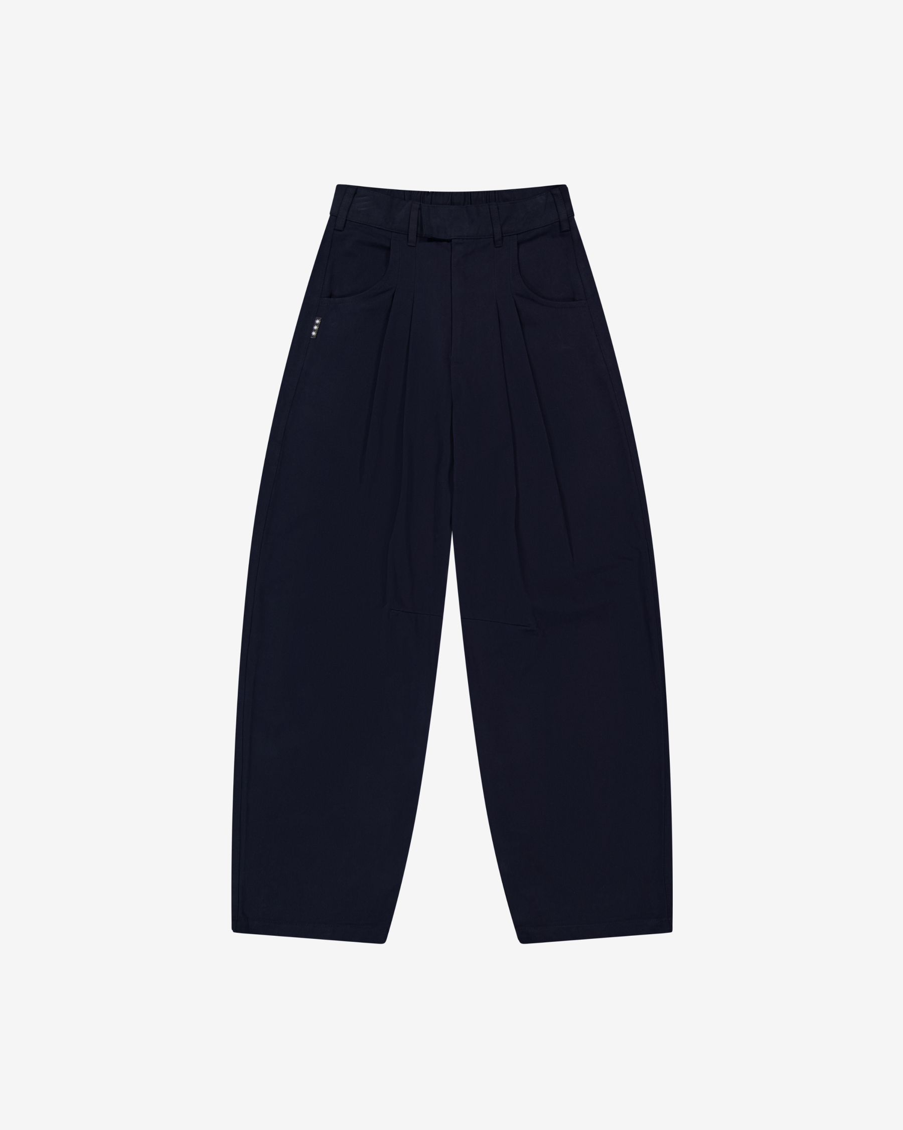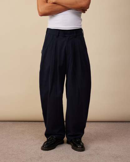 The Barrel Leg Pants are crafted from a mid-weight pleated cotton blend, offering structure with a relaxed barrel-leg fit. Designed for everyday wear, they feature double-layered back pockets and are finished with a signature embroidered logo.