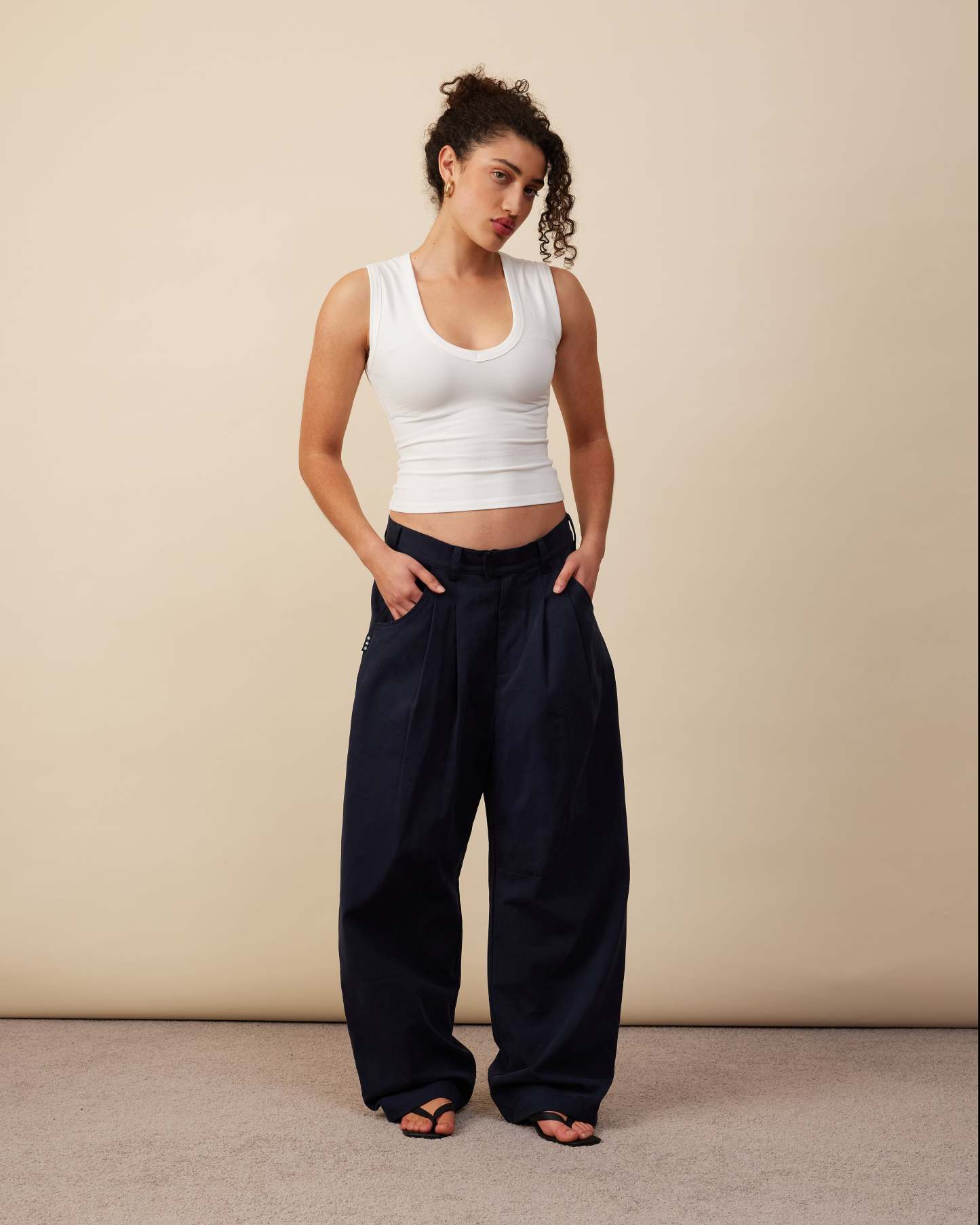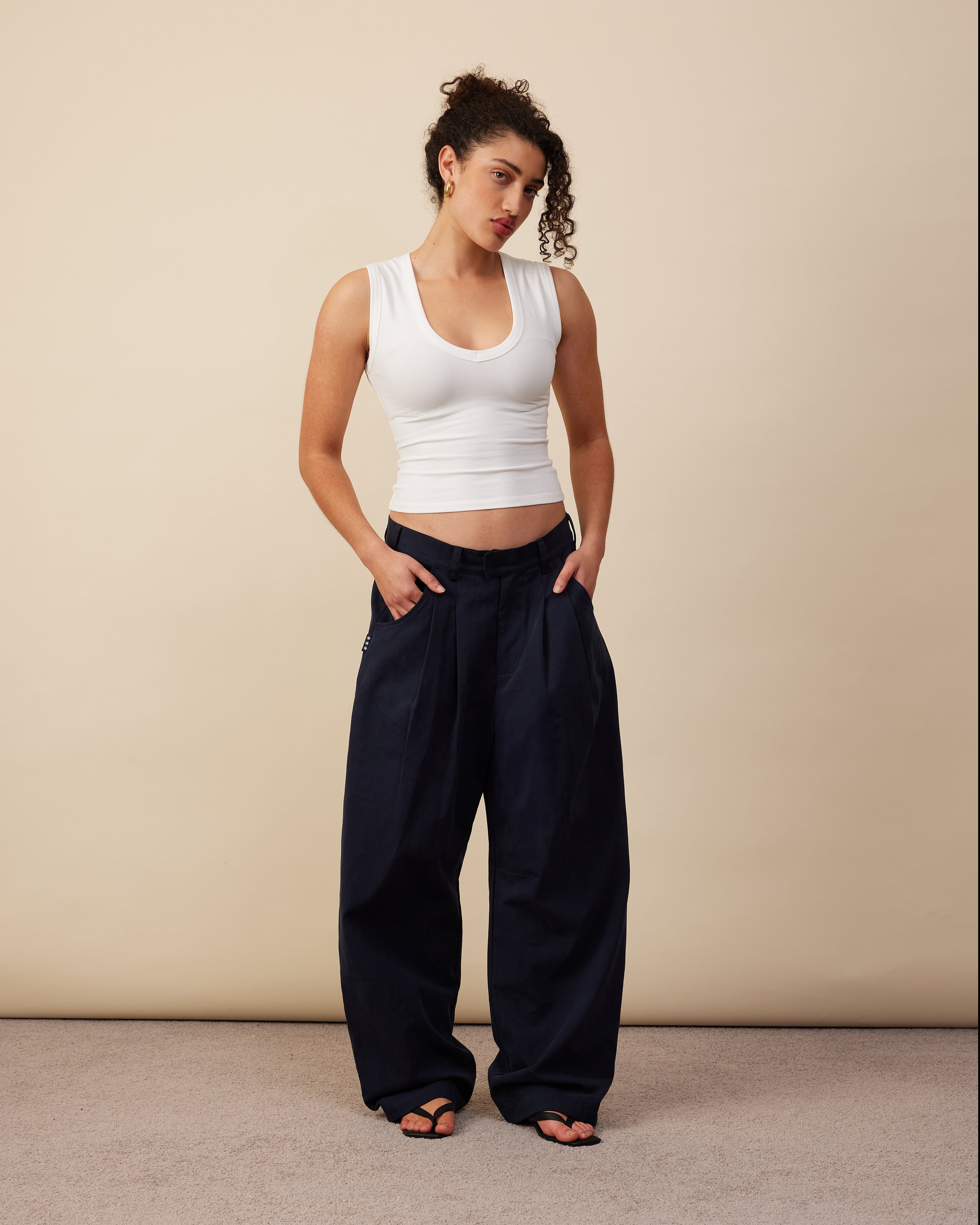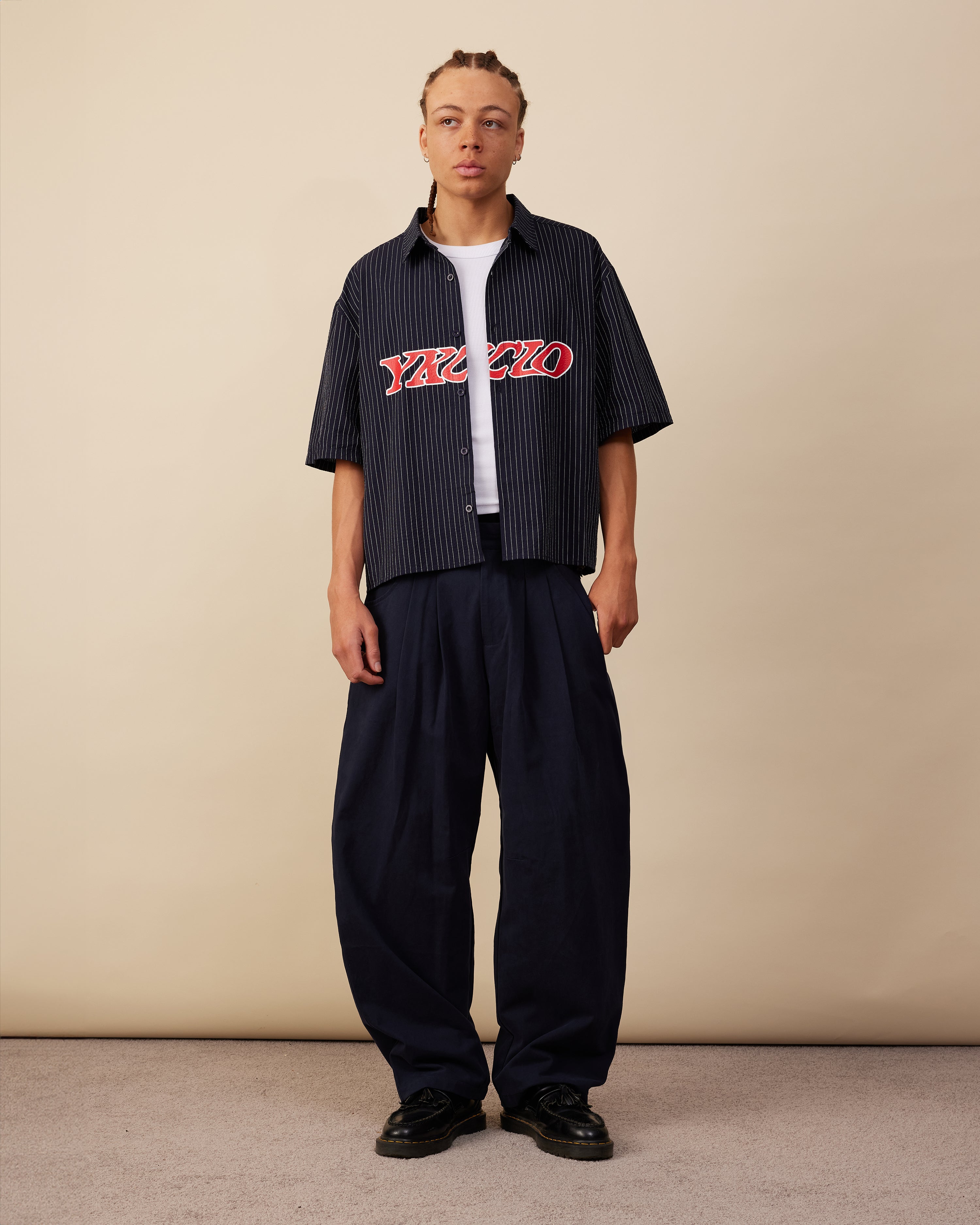 The Barrel Leg Pants are crafted from a mid-weight pleated cotton blend, offering structure with a relaxed barrel-leg fit. Designed for everyday wear, they feature double-layered back pockets and are finished with a signature embroidered logo.