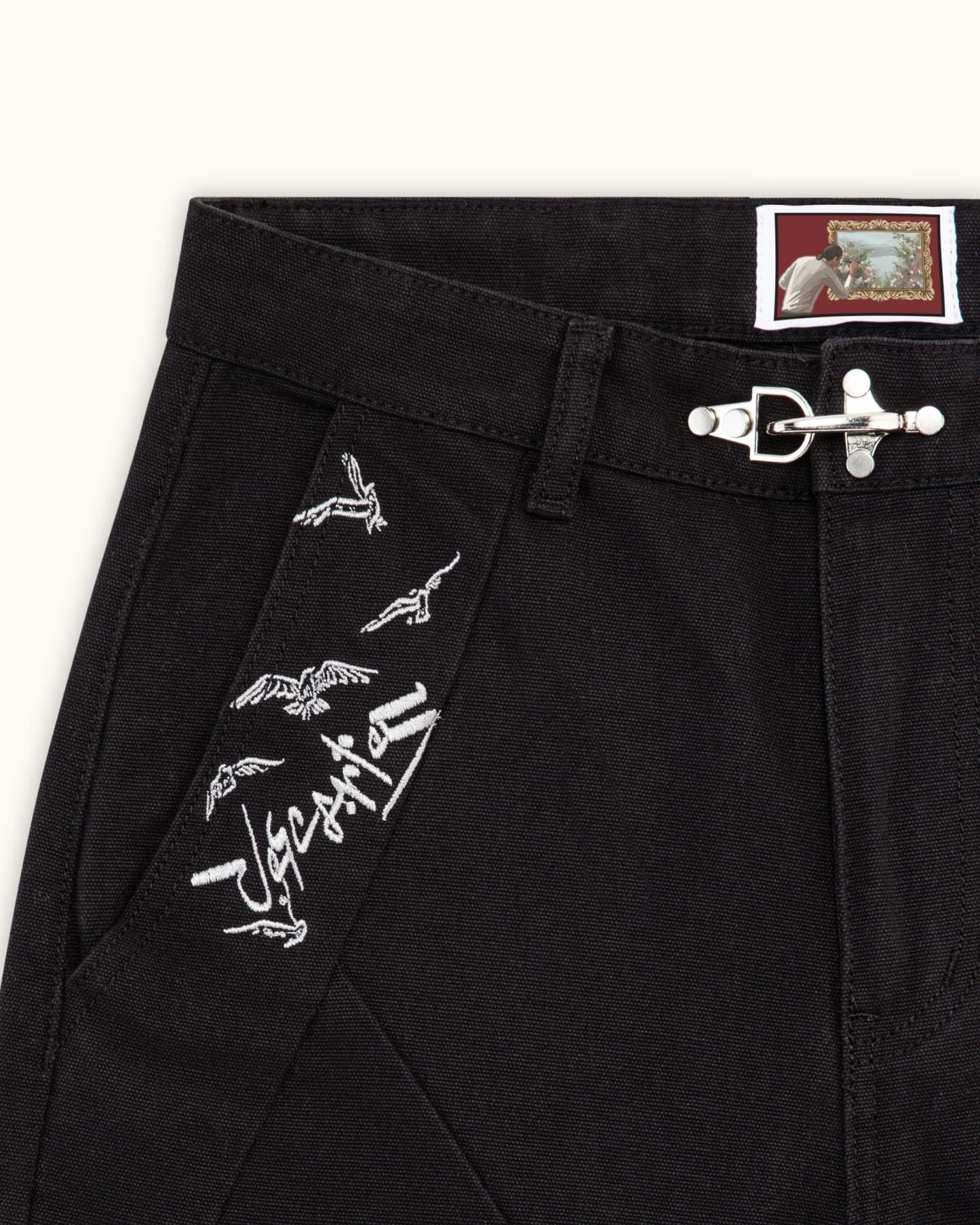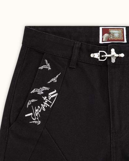 A jet-black canvas silhouette elevated with structured pleats and calligraphic detail. Carries a sweeping eagle motif across the back leg that wraps subtly to the front. A fireman-clasp buckle and tonal construction keep the look sharp, while the embroidery introduces depth and identity.