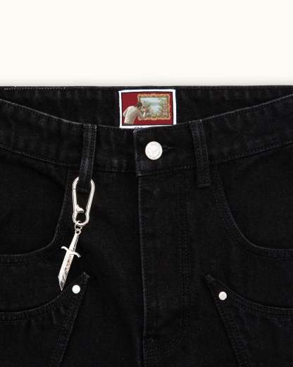 A fan favourite, brought back in black. Crafted with custom panelling on the front and back. Back embroidery depicting a knight beneath a blooming cherry blossom tree, with branches extending to the front panels. Finished with a custom leather tab, metal sword carabiner & 1,000,000+ stitches.