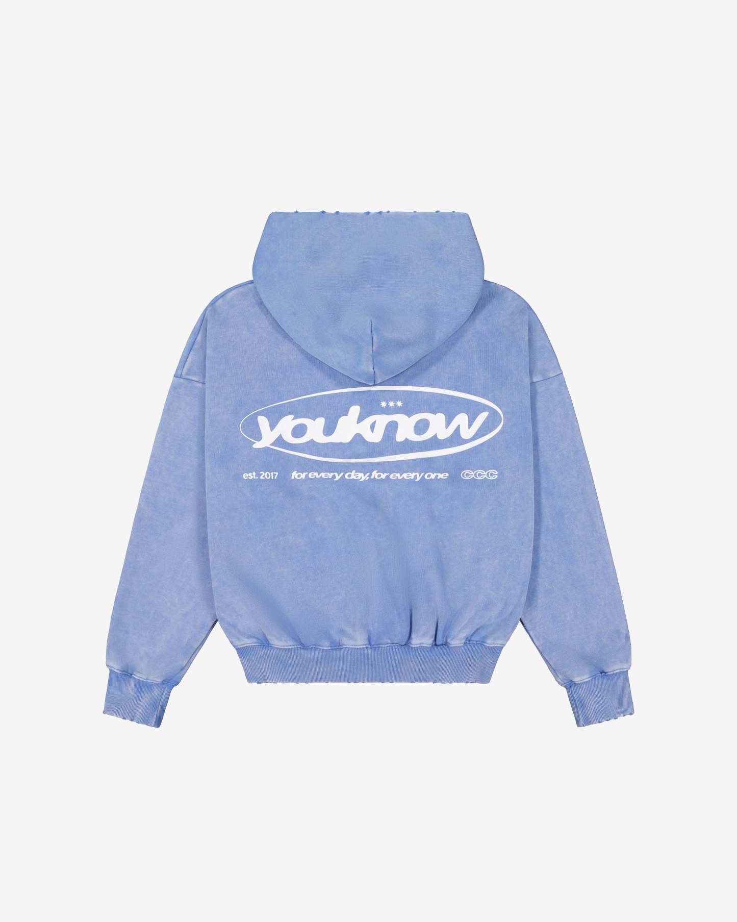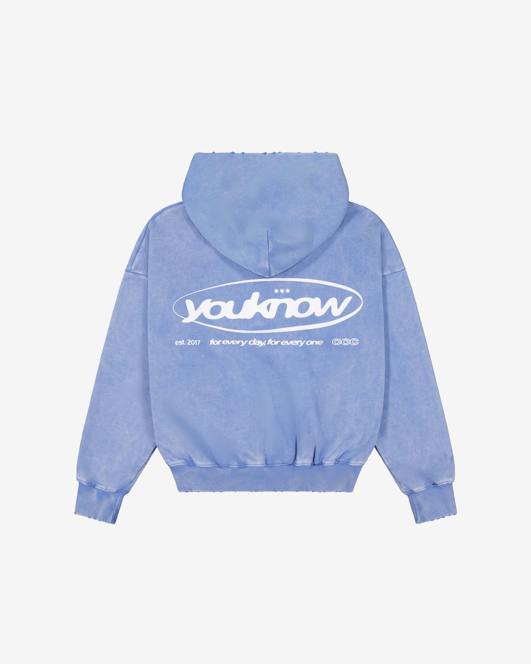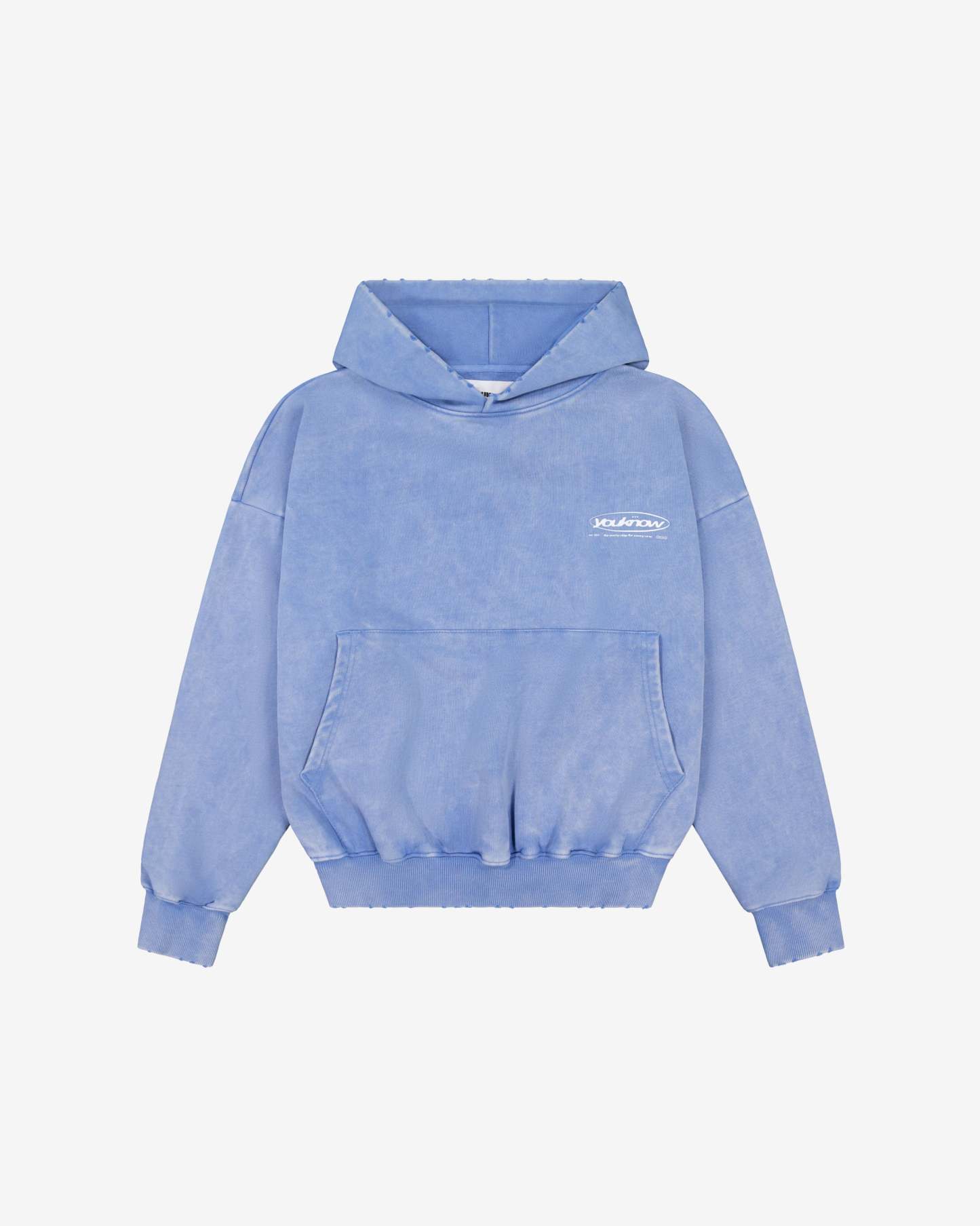 The Acid Wash Hoodie features a boxy fit with subtle distressing at the cuffs, hems, and hood for a worn-in look. Finished with coverstitch and topstitch detailing on the exterior for added texture and durability.
