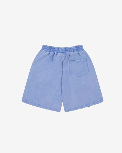 The Acid Wash Shorts are a boxy fit with subtle distressing at the hems and coverstitch/topstitch detailing for a cohesive, worn-in look.