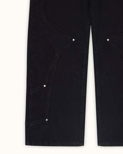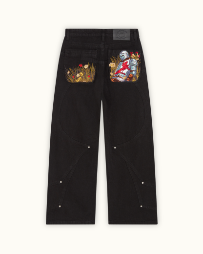 Cut from pure black denim with custom panelling and metal rivet detailing. Back pocket embroidery of a medieval knight resting on a vibrant bed of flowers, with contrasting silver armour and red accents with rich green, yellow, and red blooms. Finished with a debossed leather tab and engraved sword carabiner.