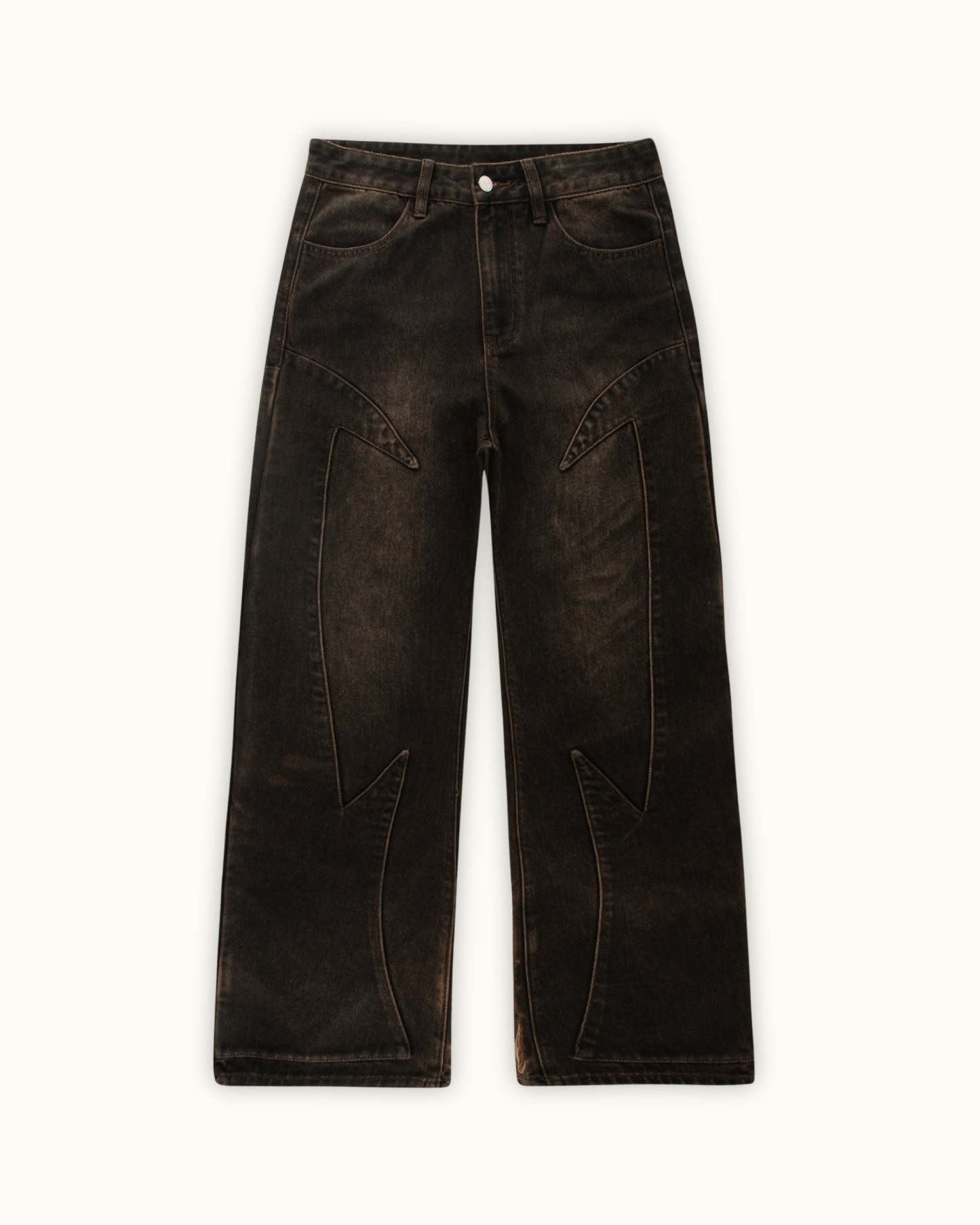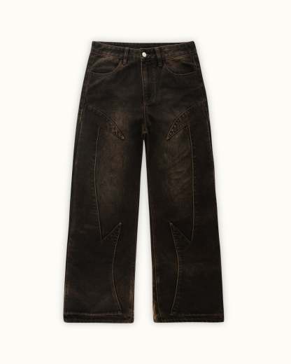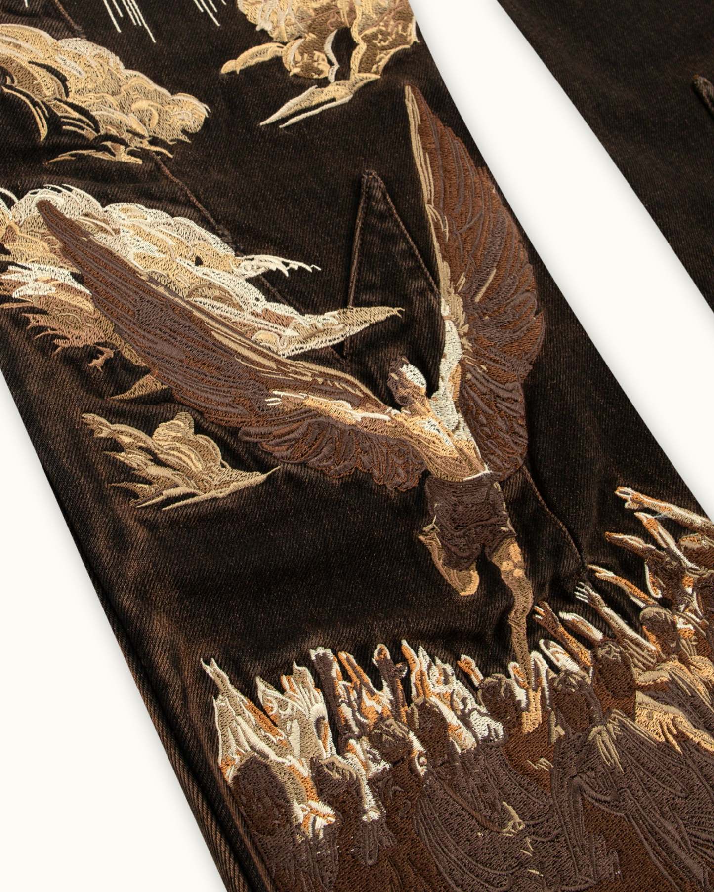 Cut in a deep brown denim with a soft thigh fade. Across the back legs, features a brown-toned 1,000,000+ stitch embroidery, inspired by The Lament of Icarus painting. Finished with custom panelling and a debossed leather tab featuring a golden-ratio 'Vescartes' logo.