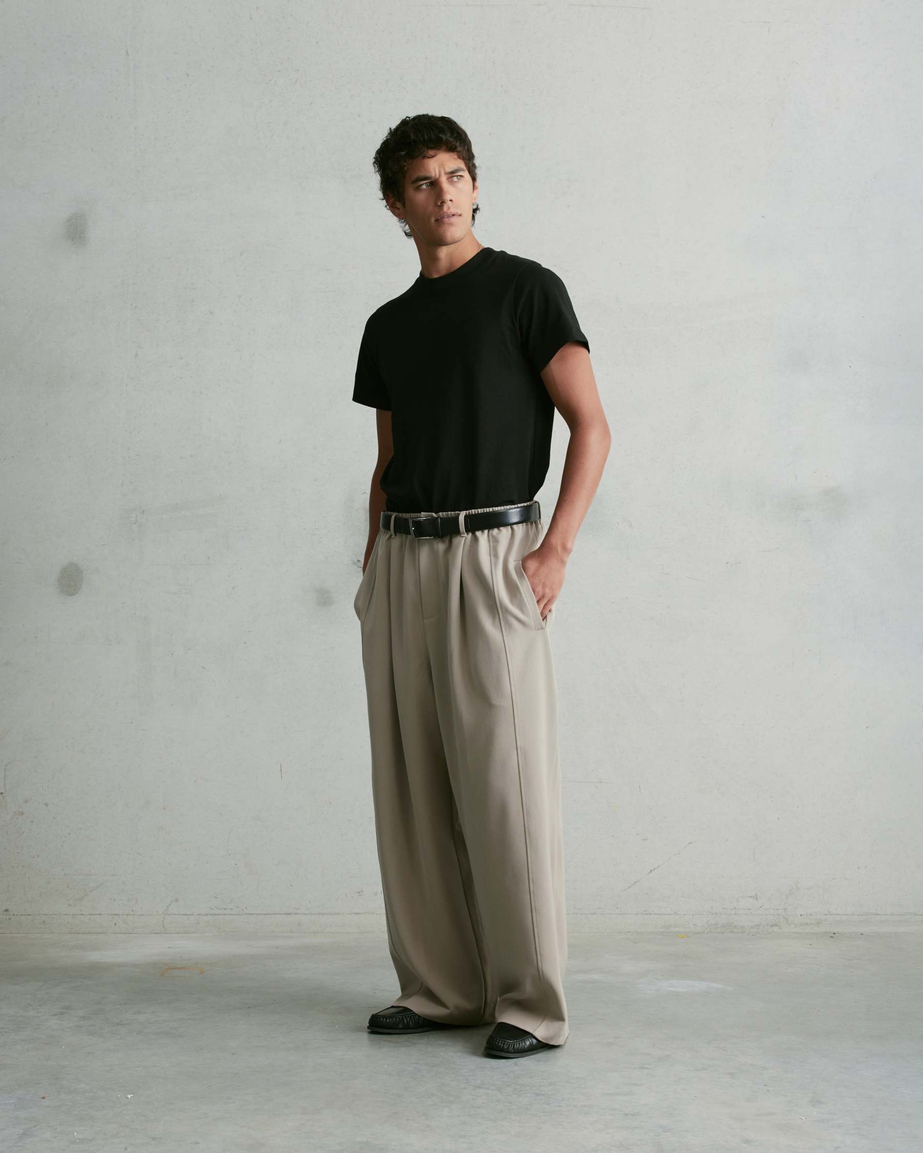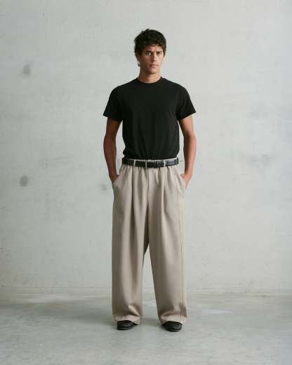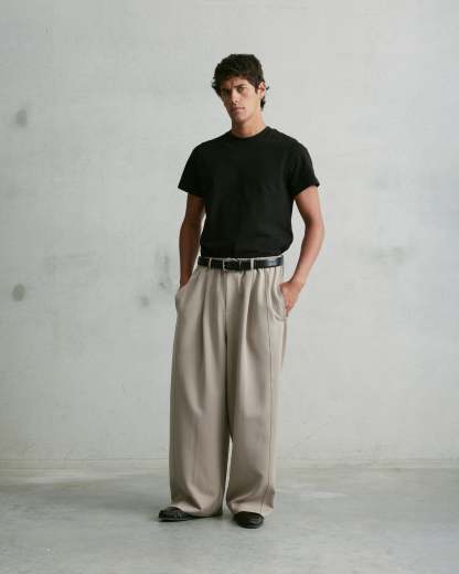 The Nothing Pleated Pants are an extra wide full-length silhouette. Designed with front and back pleats, a stretch waistband, belt loops, and a zip fly, they offer a balance of structure and ease. Finished with subtle 3D embroidery on the back pocket. We recommend sizing down on this garment.