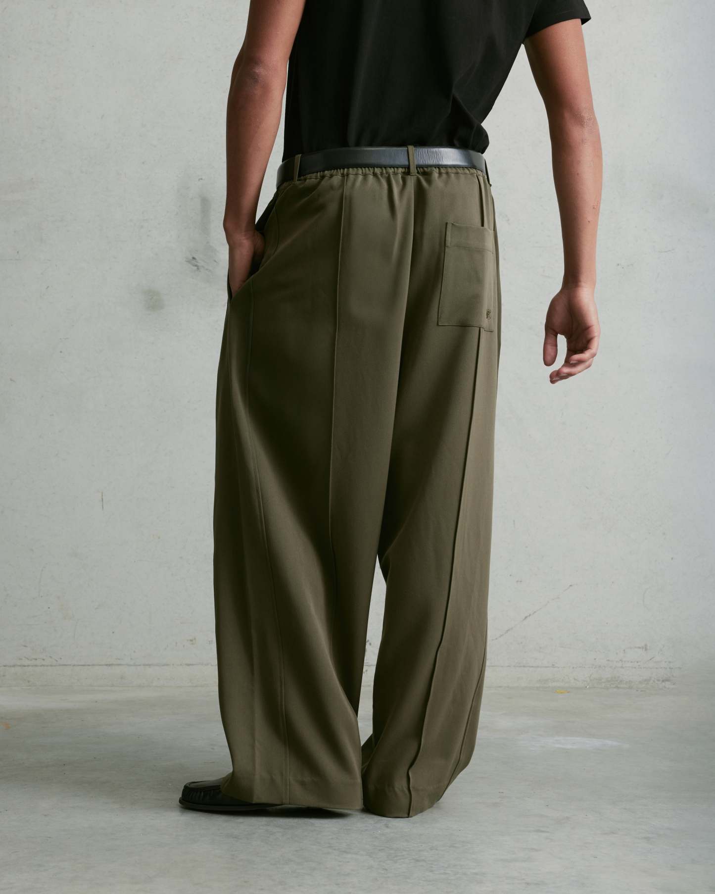 The Nothing Pleated Pants are an extra wide full-length silhouette. Designed with front and back pleats, a stretch waistband, belt loops, and a zip fly, they offer a balance of structure and ease. Finished with subtle 3D embroidery on the back pocket. We recommend sizing down on this garment.