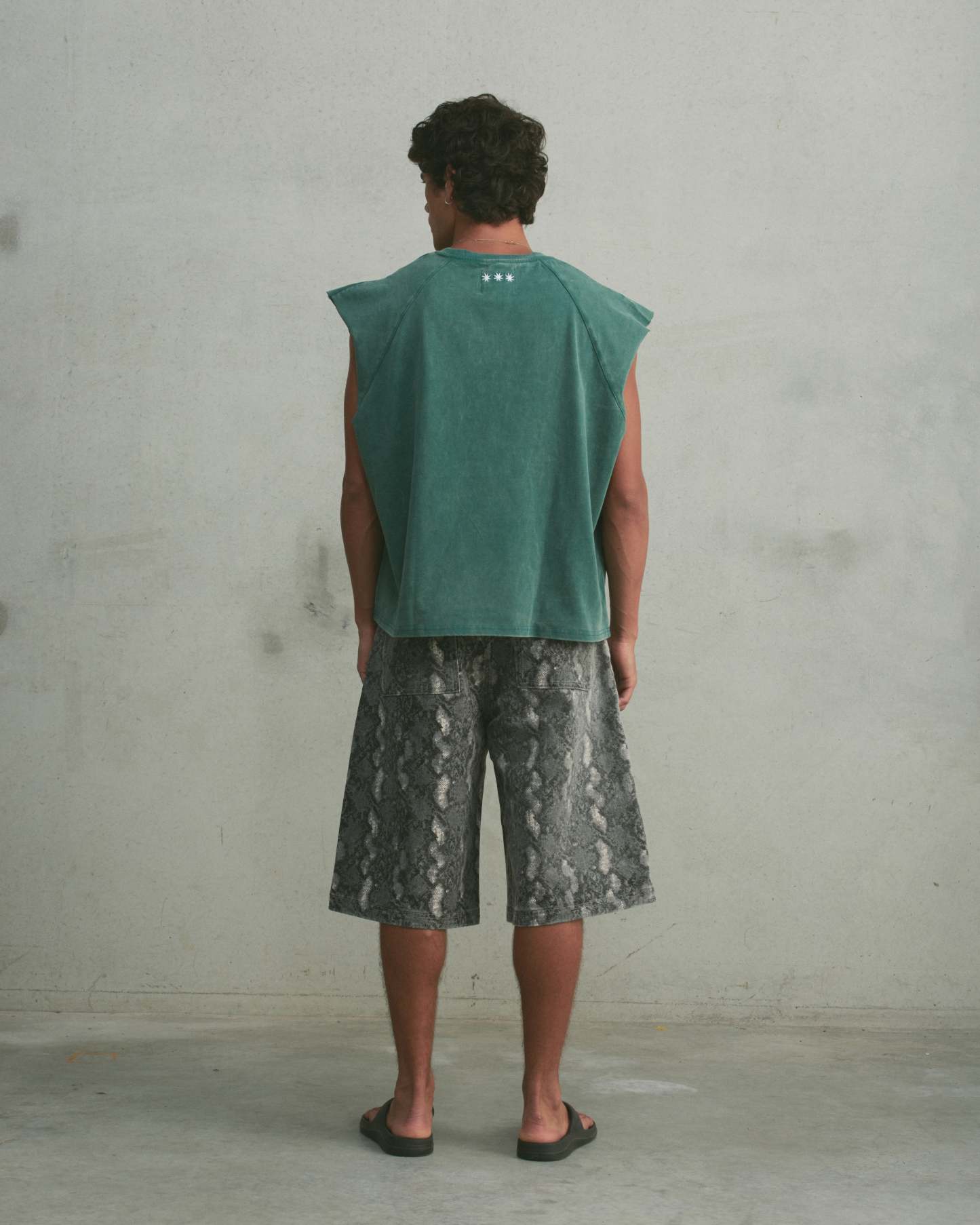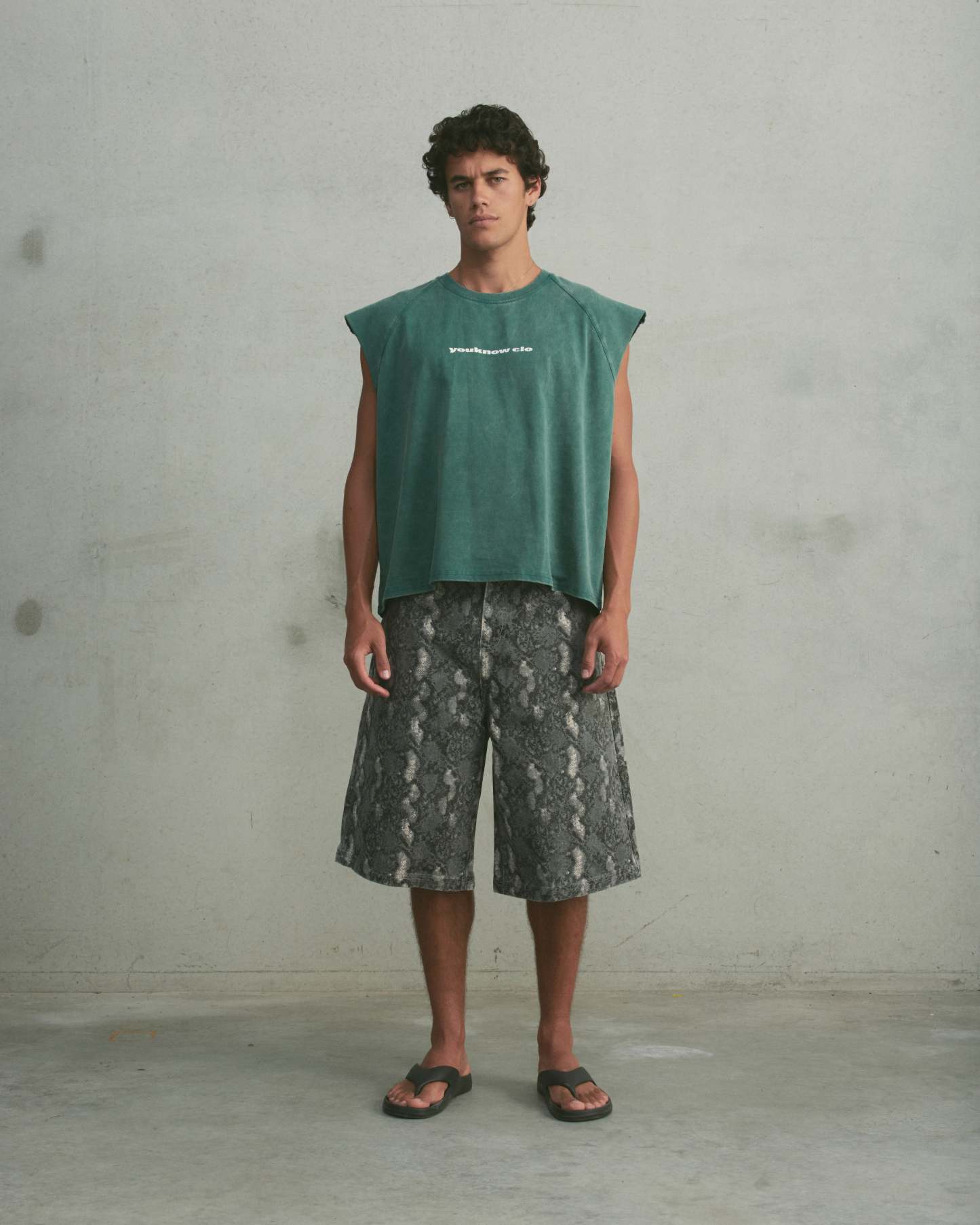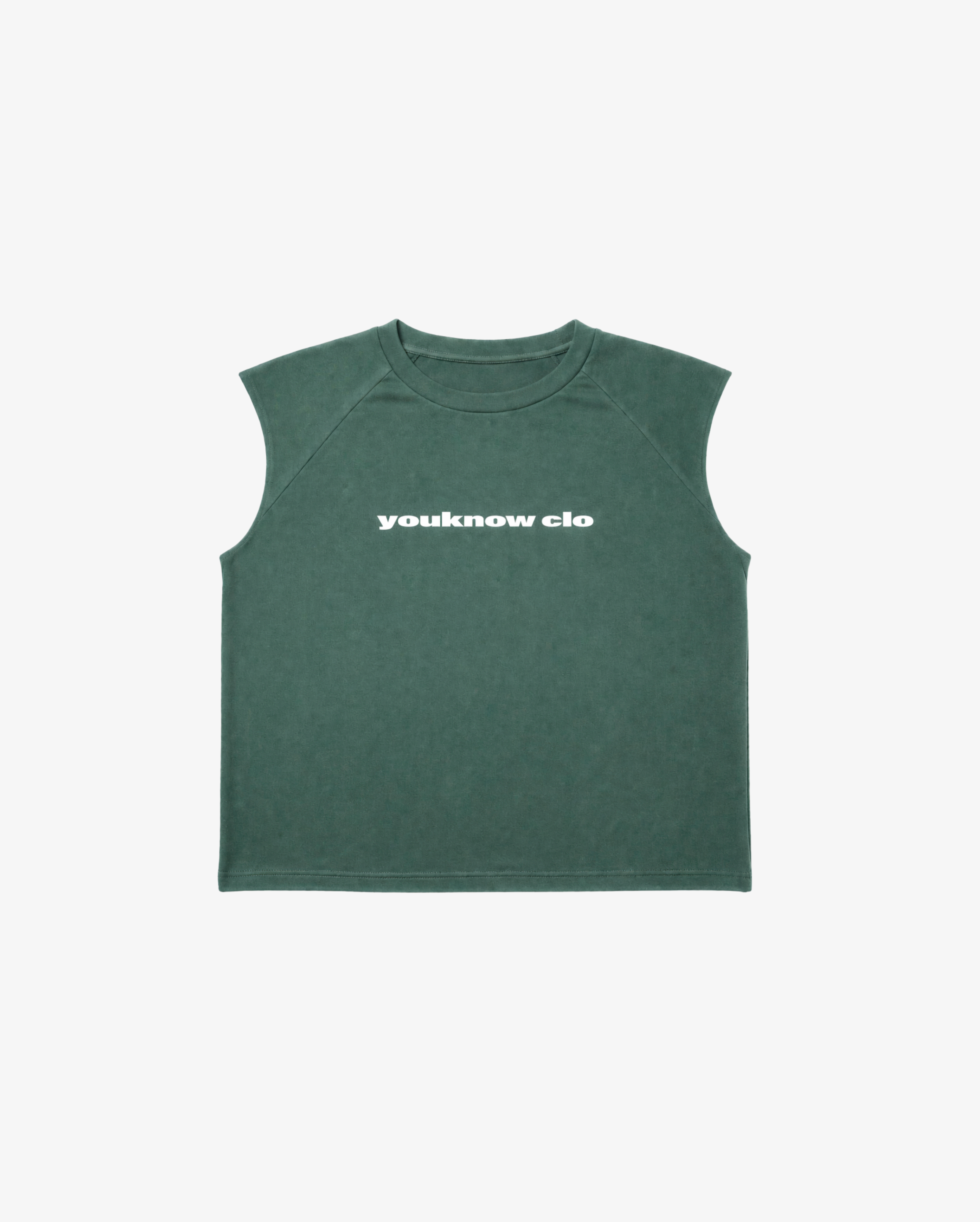 The Oversized Raglan Tank features a relaxed, boxy fit with raglan-style sleeves, a washed finish, a YOUKNOW. logo print on the front, and embroidered star detailing at the back neck.