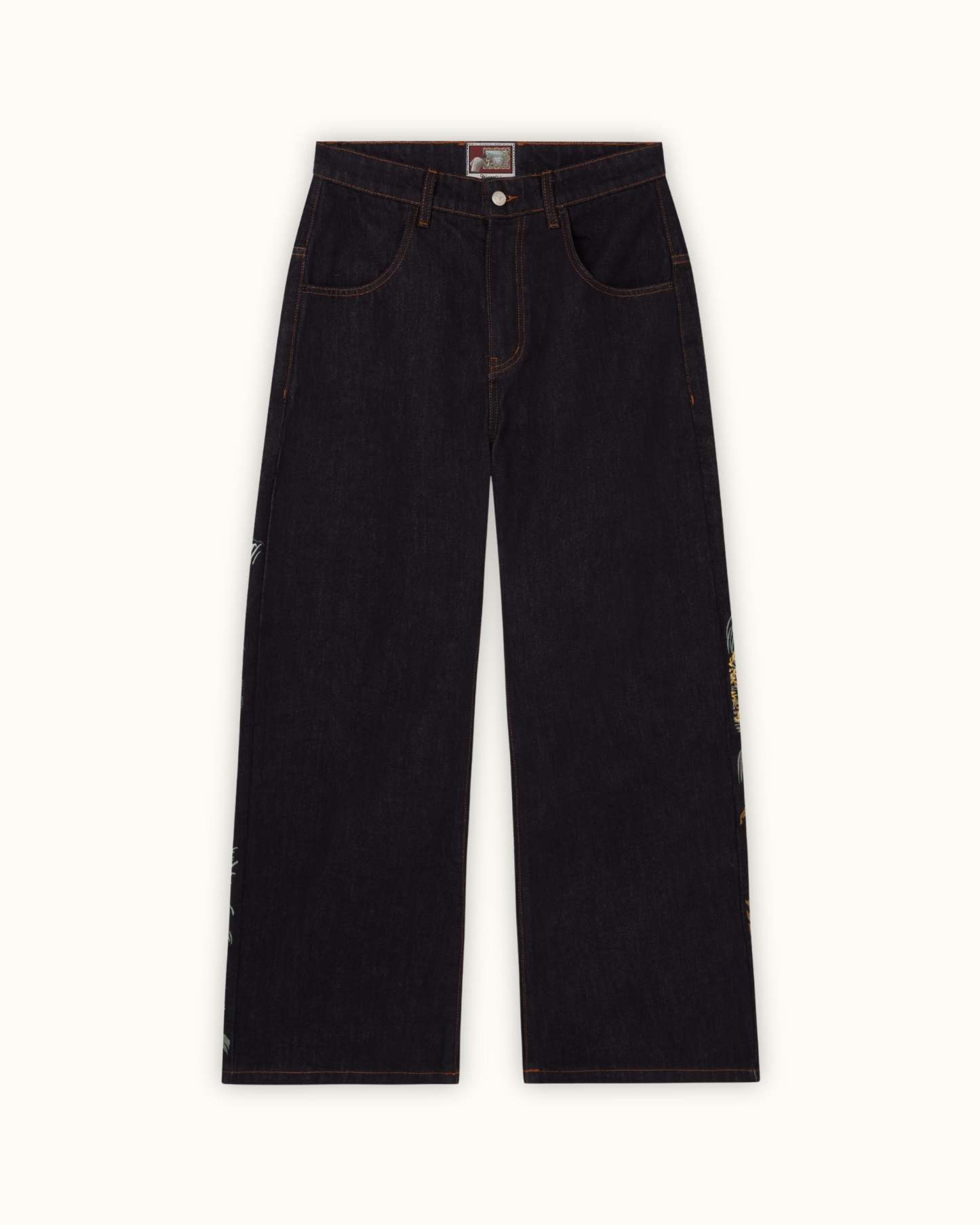 The Tsuru Denim combines a structured silhouette with intricate embroidery across both legs. The artwork unfolds as a continuous landscape, featuring cranes in motion, flowing terrain, and layered natural elements. Built with over 1,000,000 stitches, the composition balances detail with negative space.